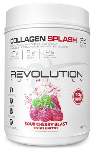 Revolution Nutrition. Collagen Splash. Marine Collagen Peptides Protein. Hair & Skin Health. Zero Sugar. For Men & Women. 11 Grams of Pure Hydrolyzed Marine Collagen Per Scoop. 420g. 35 Servings (Sour Cherry. 0.92 Pound)