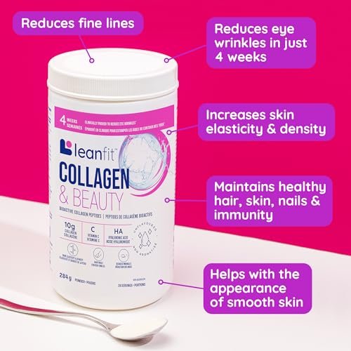 Original price was: CAD164.33.CAD39.93Current price is: CAD39.93.LEANFIT COLLAGEN & BEAUTY Unflavoured – 10g Bioactive Collagen Peptides Powder + Vitamin C + Hyaluronic Acid – Clinically Proven to Reduce Eye Wrinkles in Just 4 Weeks – 28 Servings. 284g Tub