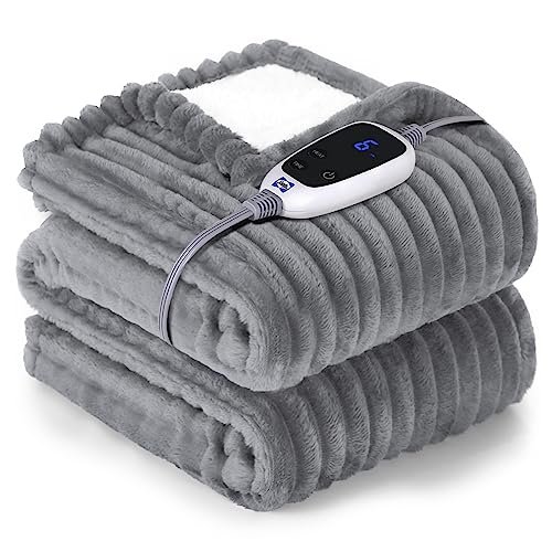 Sealy Heated Throw Blanket. Ribbed Flannel to Sherpa. 50×60. 6 Heat Levels. Auto-Off. Machine Washable. Light Grey