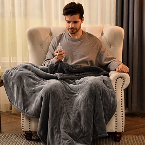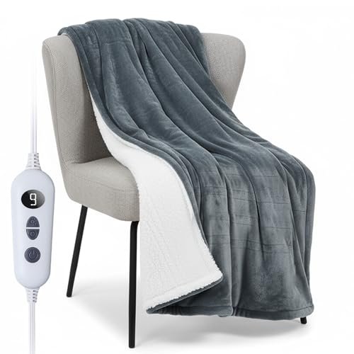 HOMLYNS LuxeHeat Heated Blanket Throw. Soft Flannel Sherpa. Electric Blanket 5 Heat Settings. Fast Heating. Heating Throw Blanket 3 Hours Timer Auto Shut Off. Machine Washable. 50×60 Inches. Grey