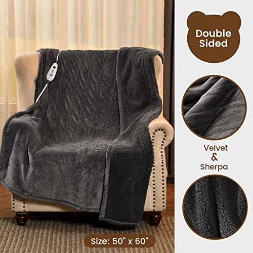 Bearhug [New Launch] Electric Heated Throw Blanket 50 Inches x 60 Inches . 5 Year Warranty. Reversible Velvet/Sherpa. 6 Heating Levels & 4H Auto Off. Over-Heat Protect. ETL Certification. Machine Washable. Gray