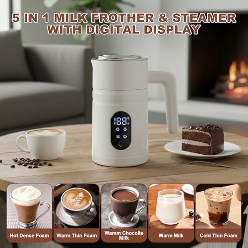4 in 1 Electric Milk Frother Automatic Hot & Cold Foam Maker Auto Shut-Off Durable Stainless Steel Milk Frother Silent Working Easy to Clean for Hot Chocolate (White-with Digital Display)