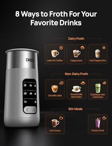 Dreo Milk Frother. 8-in-1 Electric Frother for Latte Art Coffee. 9oz/270ml Warm and Cold Foam Automatic Frothers for Dairy and Non-Dairy Milk. LED. Easy to Clean. BaristaMaker Air. Grey