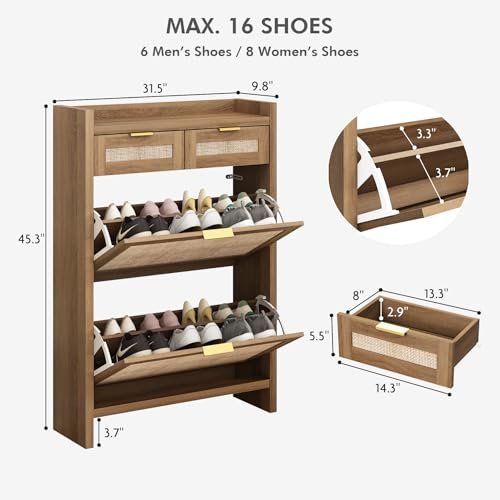 Shoe Organizer Cabinet Storage for Entryway – Slim Rattan Shoe Rack for Front Door Entrance. Narrow Hidden Shoe Cabinet with Flip Drawers. Boho Shoe Holder Cabinet .Two Doors. Oak
