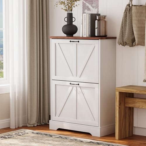 Semiocthome Farmhouse Shoe Storage Cabinet with 2 Flip Drawers. 23.6(W) Freestanding Shoe Organizer with Barn Door and Metal Handles for Entryway. Corner Rustic Narrow Shoe Rack Cabinet – White