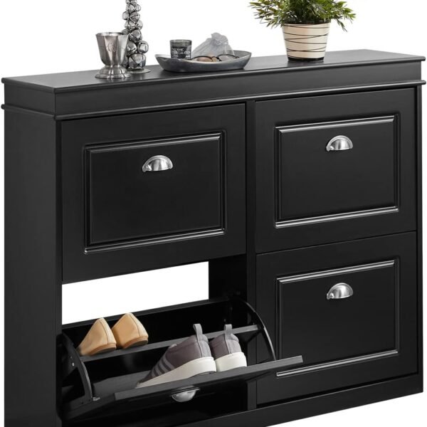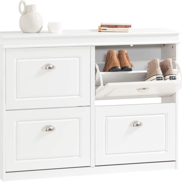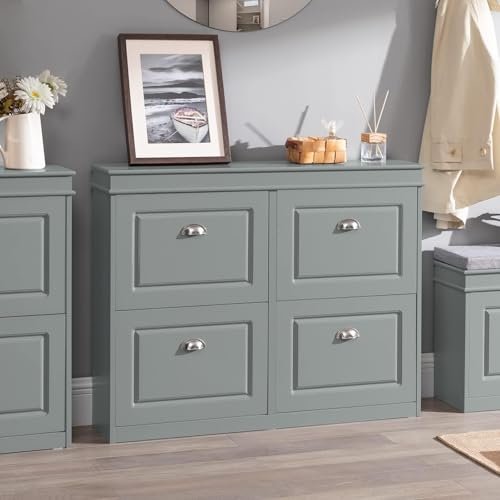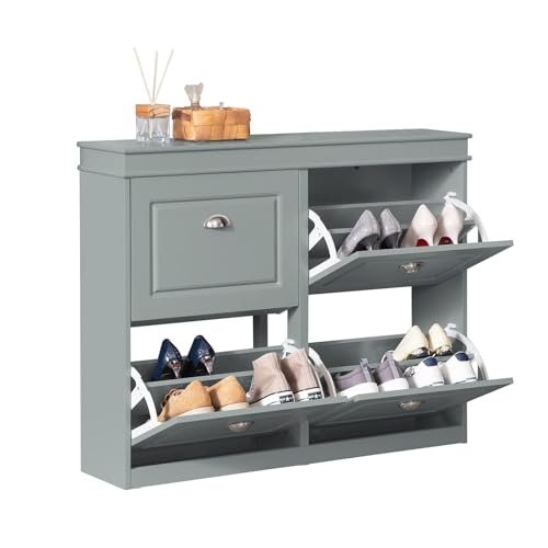 SoBuy Grey Shoe Cabinet for Entryway – 4 Flip Drawer Shoe Storage Cabinet. Slim Pantry Shoe Rack Cabinet with Dual-Layer Shelves. Shoe Racks for Entryway Organizer – Closet Bedroom Storage