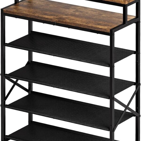 Rustic Brown UNITSTAGE Shoe Rack. 6 Tier Shoe Storage Organizer with Compartment. 4 Oxford Fabric Shelves and Top Panel. Steel Frame. Holds 16-20 Pairs of Shoes. for Entryway and Closet. Industrial. Rustic Brown