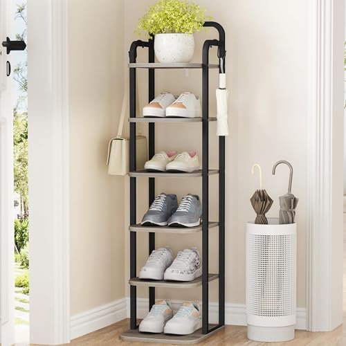 Hzuaneri Vertical Shoe Rack. 6 Tier Narrow Shoe Shelves. Wood Shoe Organizer for Closet. Entryway. Shoe Tower for Small Spaces. Free Standing. Adjustable. with 2 Hooks. Greige and Black SR04205B