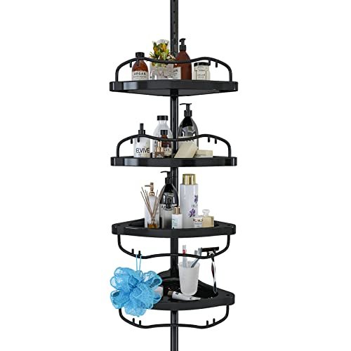 KEGII Corner Shower Caddy Tension Pole. Rustproof Bathroom Organizer with Hooks & Soap Holder. Adjustable from 25 to 114.2 inch. 4-Tier Corner Shower Rack for Bathtub Shampoo Storage – Black