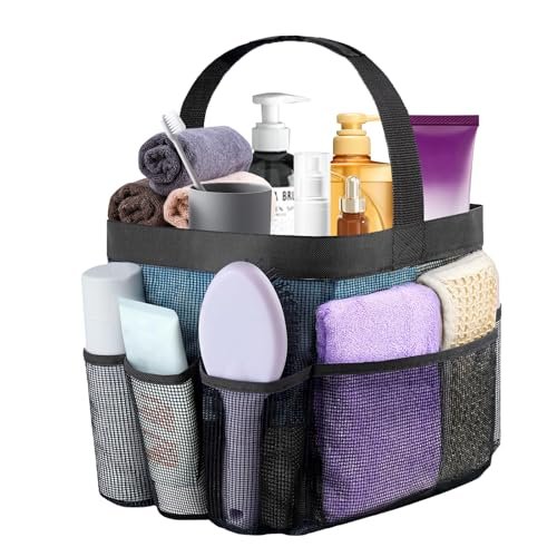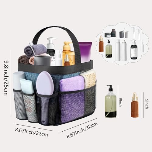 Mesh Shower Caddy Portable for College Dorm Room Essentials with 8 Pockets. Hanging Shower Caddy Dorm Basket. Quick Dry Shower Bag for Bathroom (Single Strap Handle – Black)
