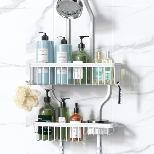 White YASONIC Shower Caddy Hanging – Never Rust Shower Organizer – Aluminum Over The Head Caddy with 10 Hooks for Razor/Sponge – Rack with Soap Basket – Silver