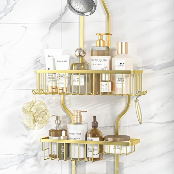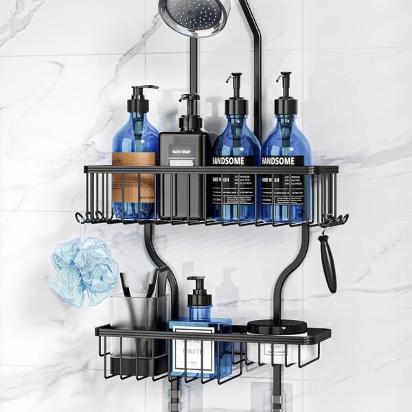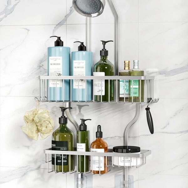 Silver HapiRm Shower Caddy Hanging No Drilling. 3 Tier Over Head Shower Caddy. Bathroom Organizers with 2 Soap Holder & 12 Hooks. Bathroom Shelf Organizer for Shampoo. Soap. 12.6 x 4.7 x 28.3in