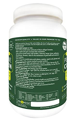 - HIGH-QUALITY. GRASS-FED BOVINE COLLAGEN: The Promise Pure Bovine Collagen Supplement is Gluten-Free. GMO-Free. and does not contain soy. nuts. corn. wheat. or yeast. Sourced from grass-fed. pasture-raised Brazilian Bovine (free of growth hormones and antibiotics) – Halal and Kosher Certified.