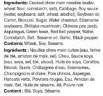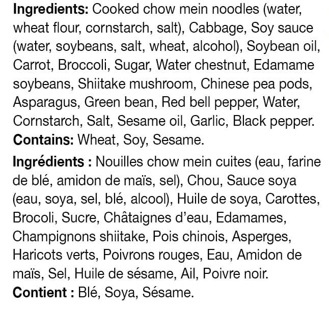 IngredientsCooked chow mein noodles (water. wheat flour. cornstarch. salt). Cabbage. Soy sauce (water. soybeans. salt. wheat. alcohol). Soybean oil. Carrot. Broccoli. Sugar. Water chestnut. Edamame soybeans. Shiitake mushroom. Chinese pea pods. Asparagus. Green bean. Red bell pepper. Water. Cornstarch. Salt. Sesame oil. Garlic. Black pepper. Contains: Wheat. Soy. Sesame.
