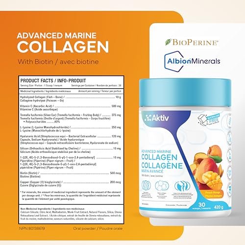 AKTIV Advanced Marine Collagen Powder with Biotin & Hyaluronic Acid | Peach Mango | Sucralose-Free | Supports Skin. Hair. Nails & Joints | Made in Canada