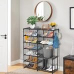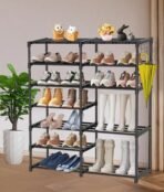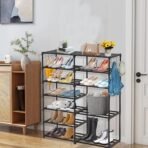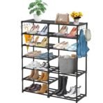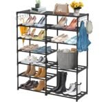 • 【LARGE CAPACITY】: The shoe storage shelf has large capacity to hold 24–30 pairs of shoes. and the shoe rack organizer keeps your little space tidy. Different height shoe racks are made to accommodate larger accessories like shoe boxes. heels. boots. and so on. With its ten multipurpose hooks. the shoe organizers and closet storage allow you to hang a lot of items. It is also easy to clean and waterproof thanks to its three PP sheets.