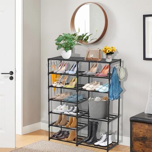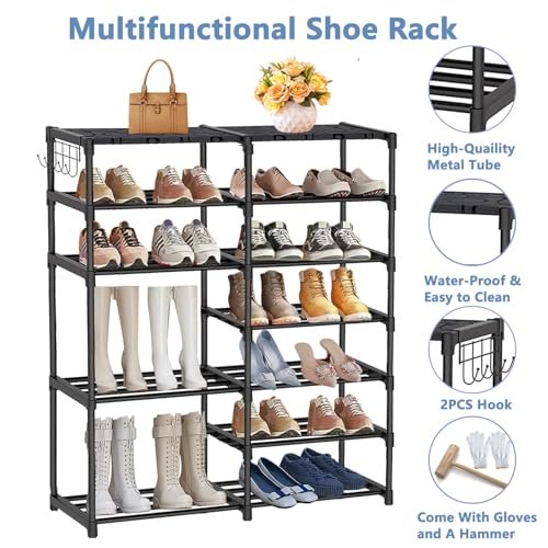 • 【LARGE CAPACITY】: The shoe storage shelf has large capacity to hold 24–30 pairs of shoes. and the shoe rack organizer keeps your little space tidy. Different height shoe racks are made to accommodate larger accessories like shoe boxes. heels. boots. and so on. With its ten multipurpose hooks. the shoe organizers and closet storage allow you to hang a lot of items. It is also easy to clean and waterproof thanks to its three PP sheets.