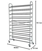 The AmazonBasics 50-pair shoe rack measures approximately 35.8 L x 14.6 W x 59.5 H inches. Thanks to its small footprint. the shoe rack fits nicely into standard-size closets for easy. yet out-of-the-way access to all your favorite footwear.