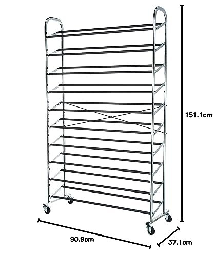 The shoe rack offers exceptionally convenient vertical space for organizing and neatly displaying up to 50 pairs of shoes–anything from men’s oxfords. loafers. slippers. and flip-flops to women’s wedges. heels. booties. sandals. and sneakers. Ten tiers of nonslip tubes hold shoes securely in place while positioning them slanted slightly forward for easier viewing. Grab the desired pair and head out the door–no more wasted time spent searching.