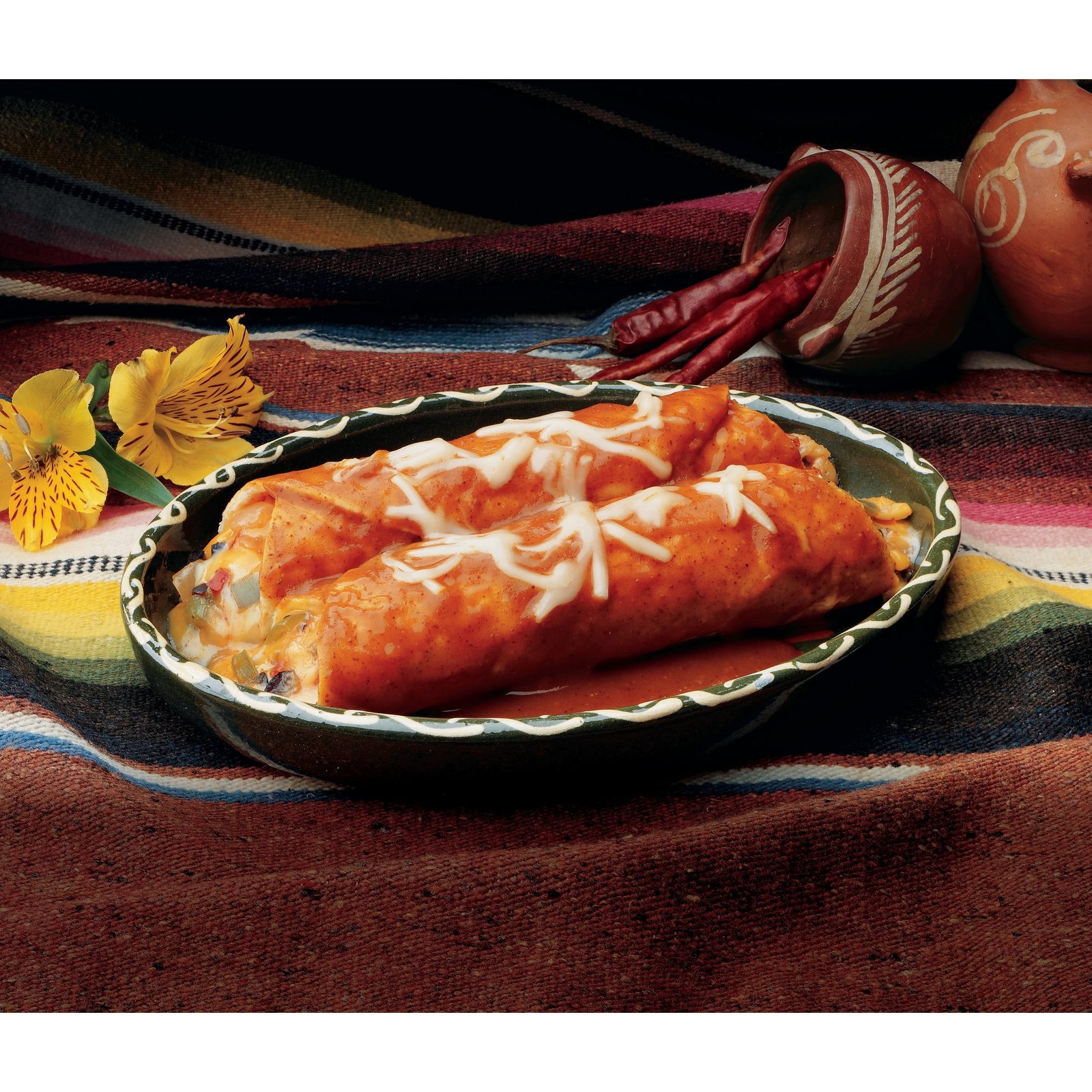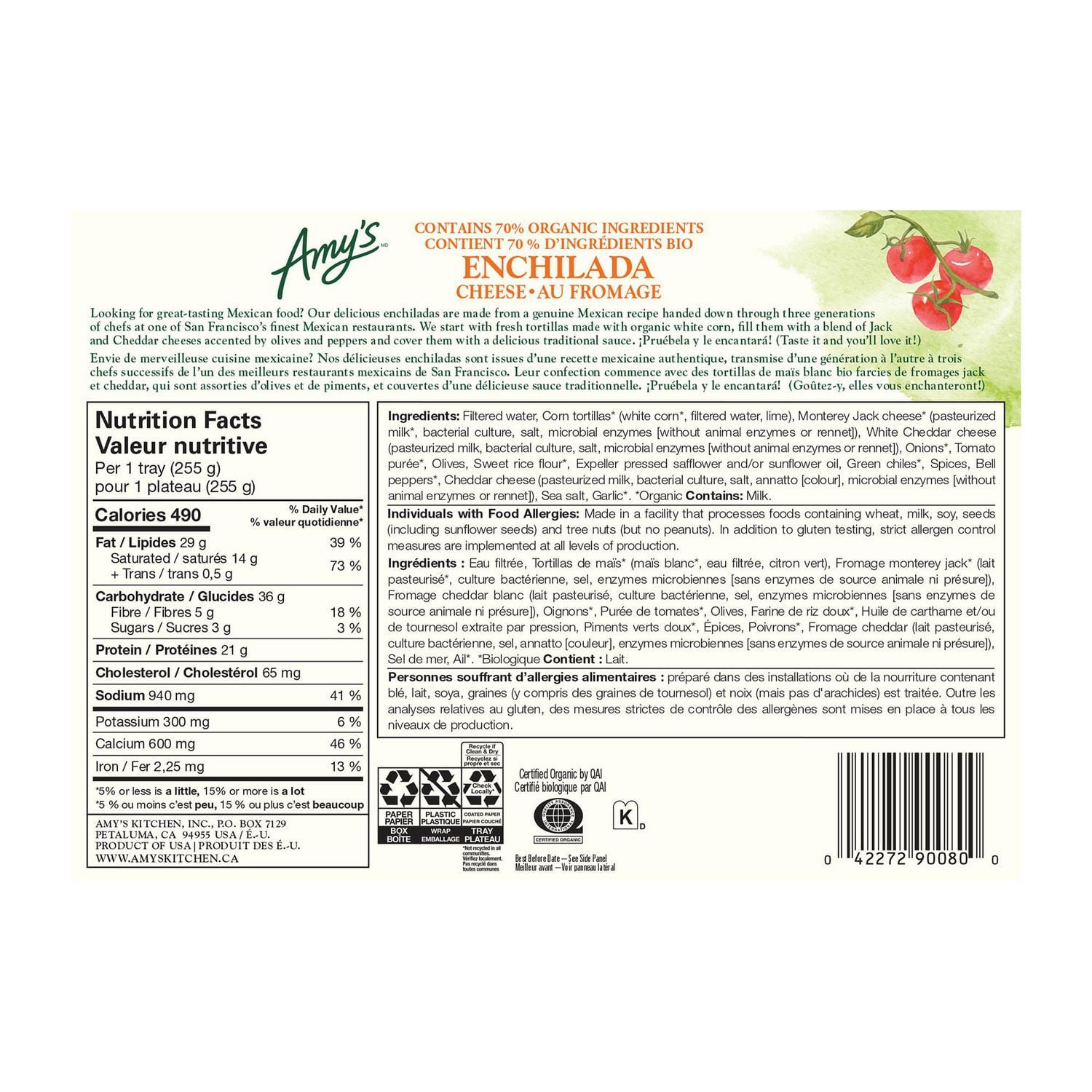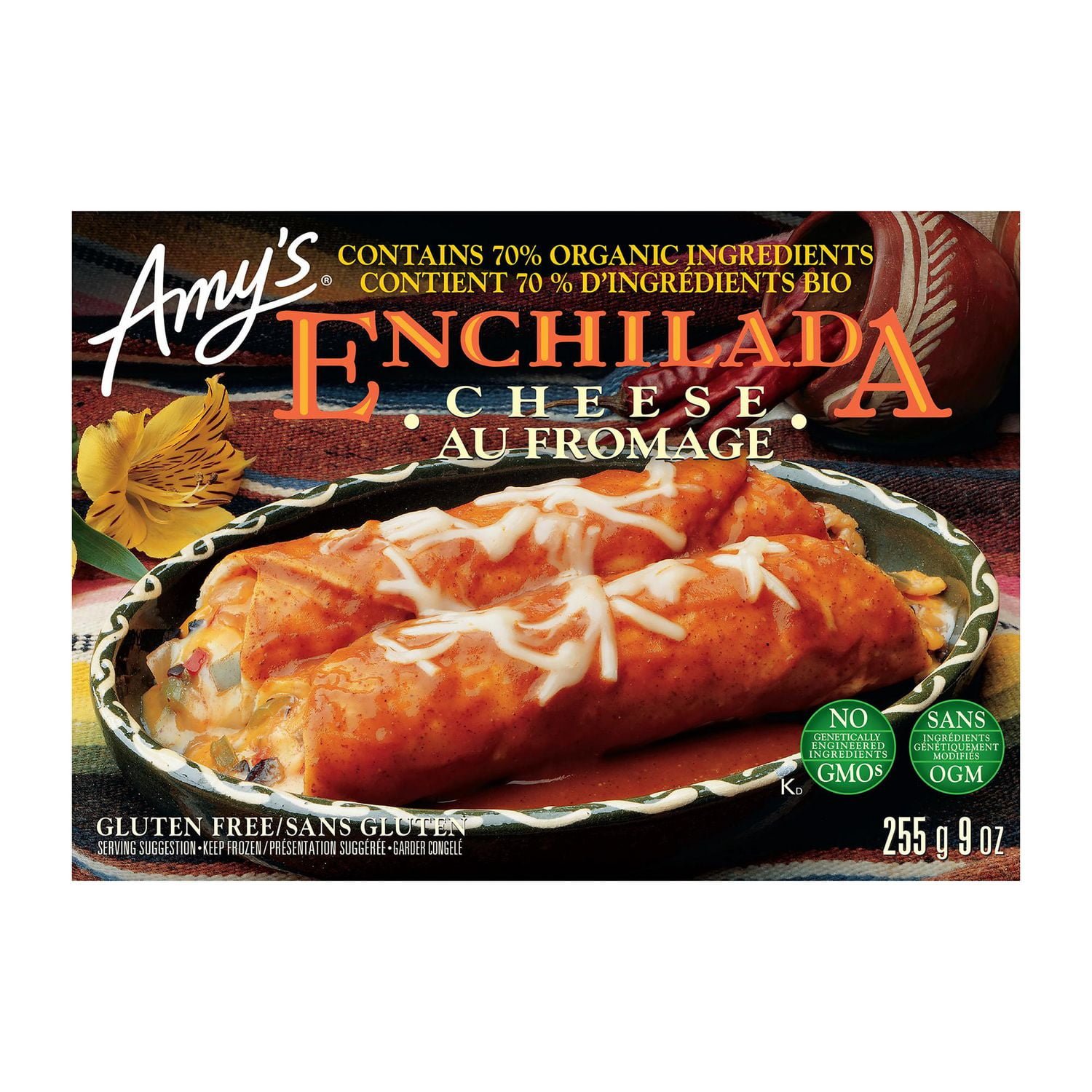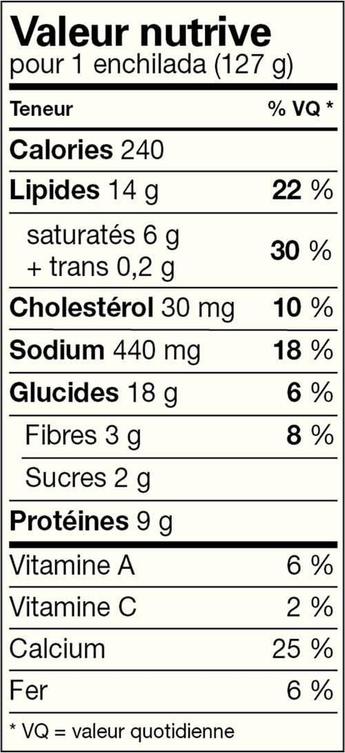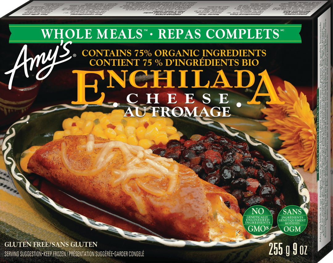 This is comfort food. Mexican style. Two tortillas made from ground organic corn. filled with a blend of cheeses. accented by olives and peppers and covered in our tasty. traditional enchilada sauce.We believe that cooking was meant to be done by hand. That’s why our burritos and enchiladas are hand-rolled. Our pizza crusts and tortillas are hand-stretched. Our pizza toppings are placed by hand. and our cheese is sprinkled by hand. We make our sauces from scratch. stirring in spices and vegetables. then simmering slowly for hours until the flavour is perfect. Many of our sauces start with a roux cooked under gentle heat and stirred continuously until just right.Easy to Prepare. Made with organic ingredients. Gluten free/soy free/tree nut free/kosher