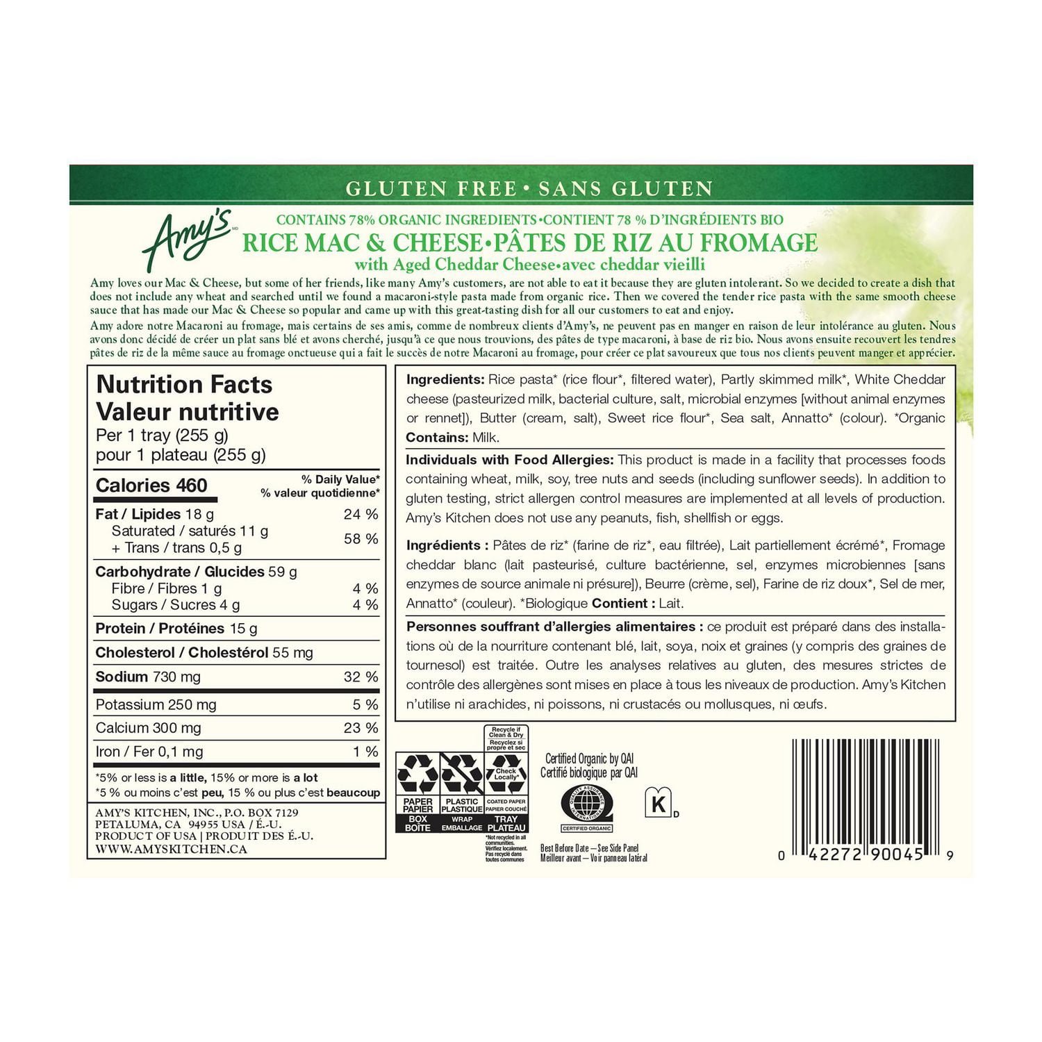 | Ingredients | Organic rice macaroni (organic rice flour. water). organic partly skimmed milk. Cheddar cheese (pasteurized milk. bacterial culture. salt. microbial enzyme [without animal enzymes or rennet]). butter. organic sweet rice flour. sea salt. organic annatto. Contains milk. |
