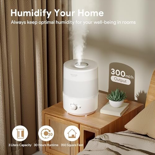 • Effortless Comfort All Night: The humidifier runs up to 30 hours with a 3 liters semitransparent water tank. ensuring you a comfortable sleep through the night without congestion. dry throat. or dry skin!