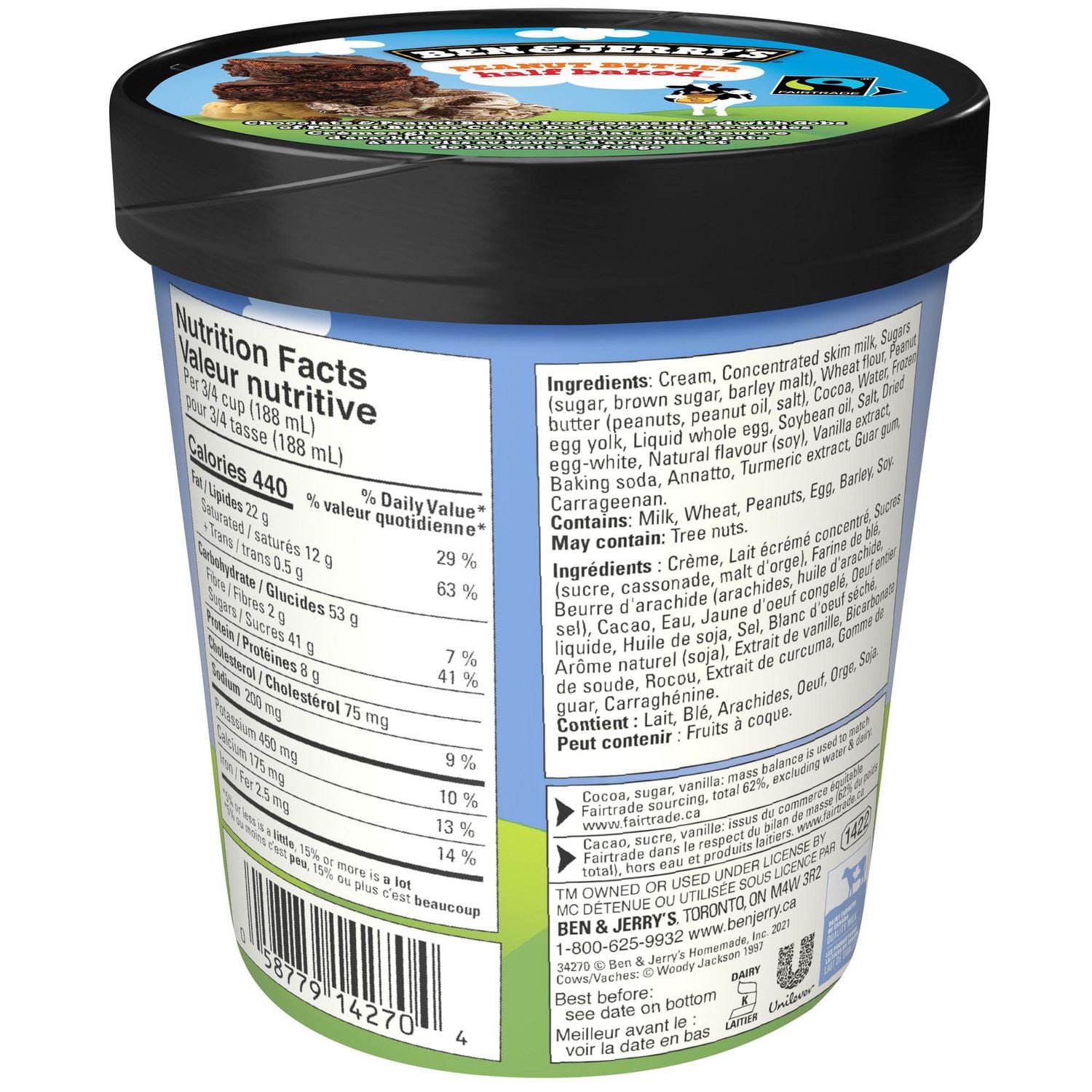 | Ingredients | Ingredients: Cream. Concentrated skim milk. Sugars (sugar. brown sugar. barley malt). Wheat flour. Peanut butter (peanuts. peanut oil. salt). Cocoa. Water. Frozen egg yolk. Liquid whole egg. Soybean oil. Salt. Dried egg-white. Natural flavour (soy). Vanilla extract. Baking soda. Annatto. Turmeric extract. Guar gum. Carrageenan. Contains: Milk. Wheat. Peanuts. Egg. Barley. Soy. May contain: Tree nuts. |