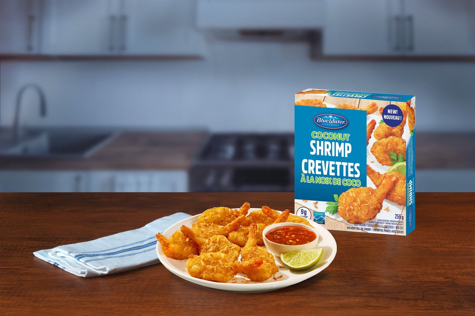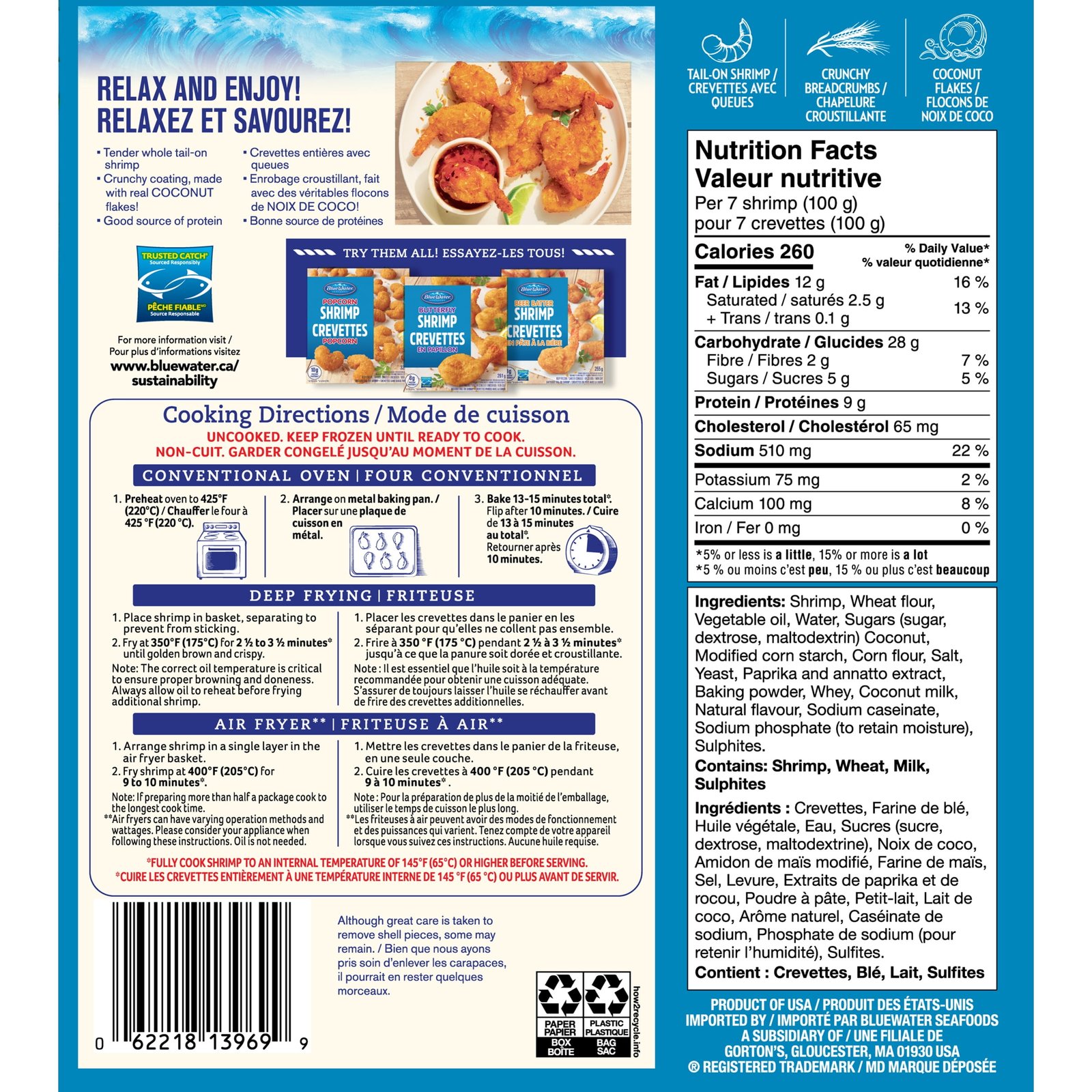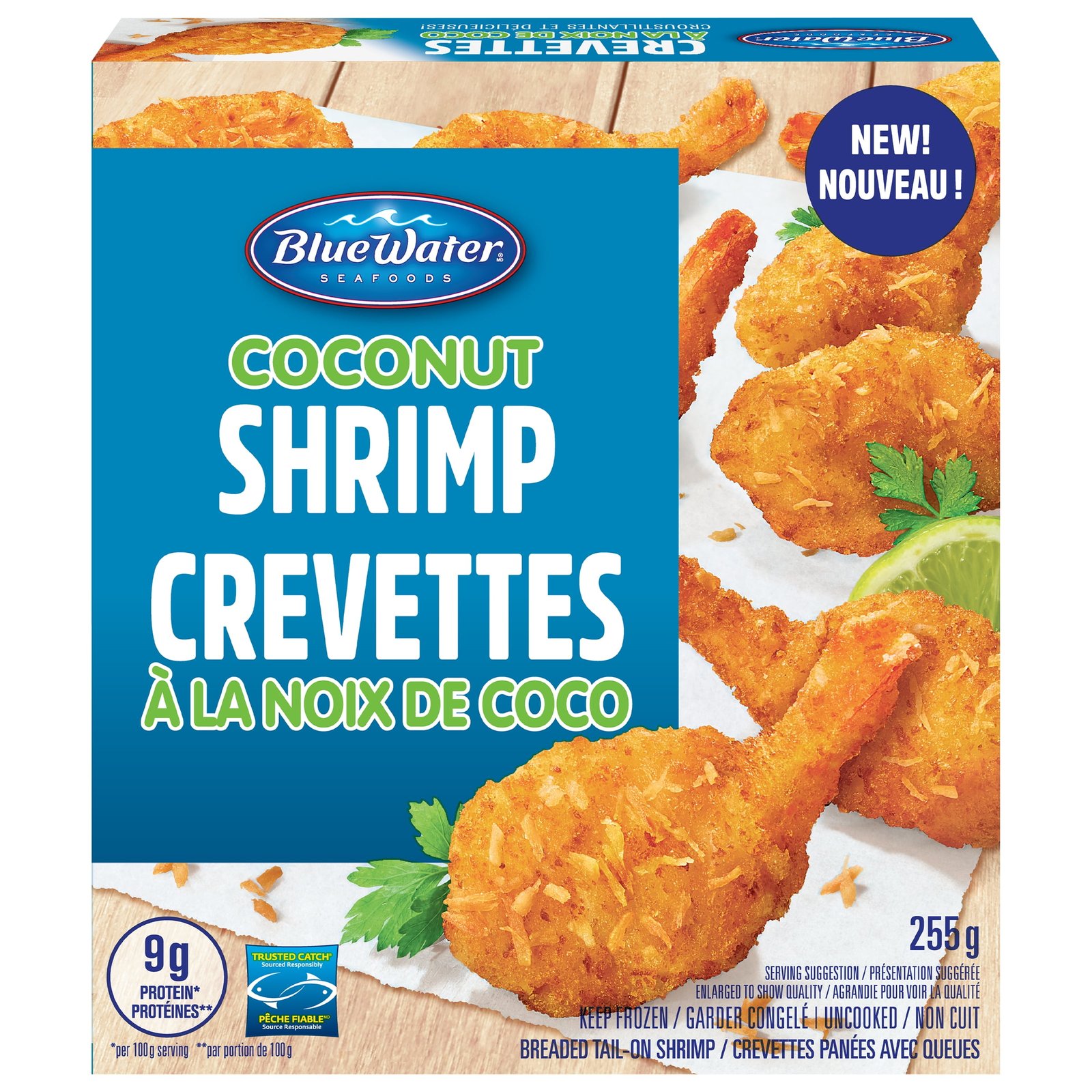 BlueWater Seafoods Coconut Shrimp Whole Shrimp. Breaded with Crunchy Panko Breadcrumbs. Frozen. 255 g Package. Crunchy coconut shrimp with panko breading