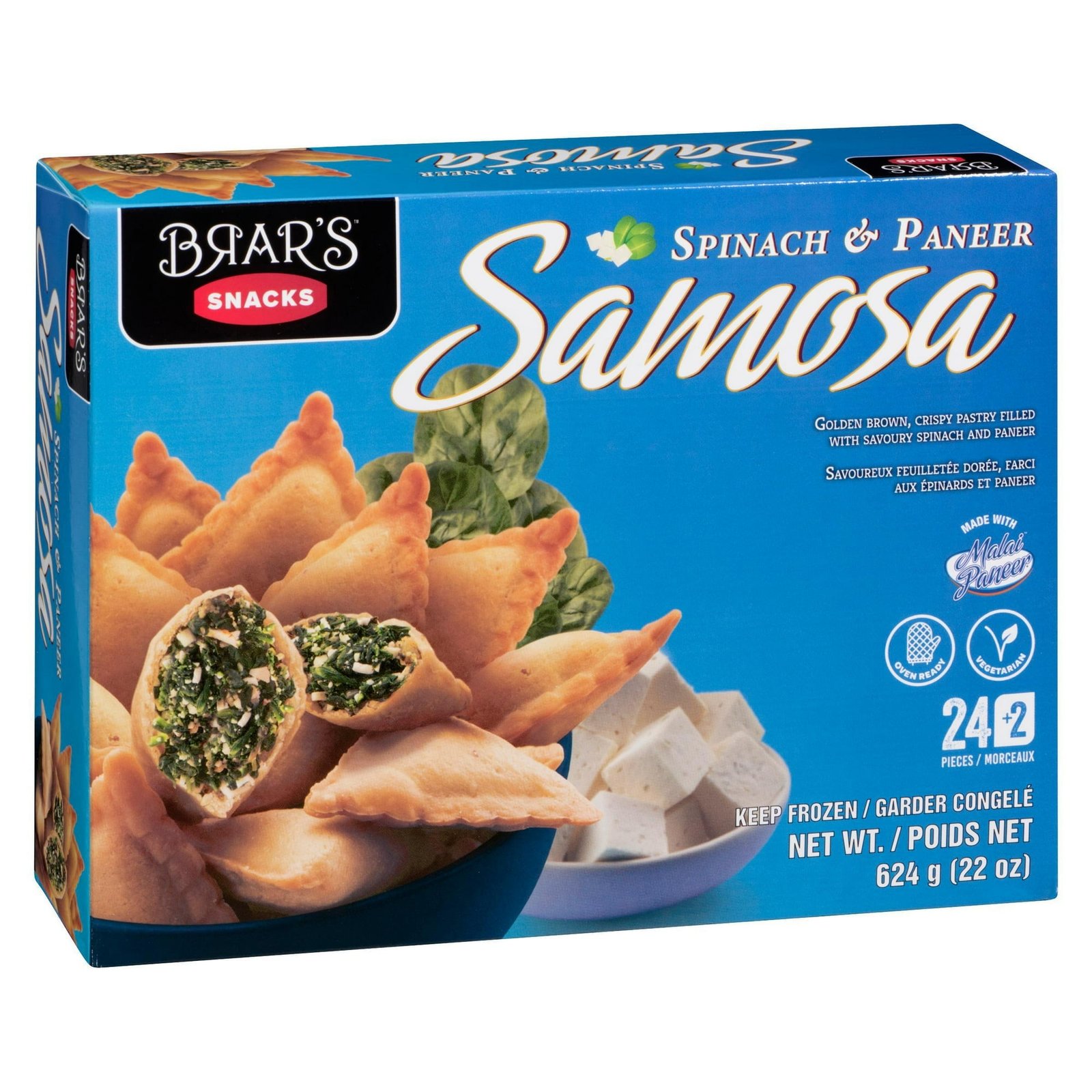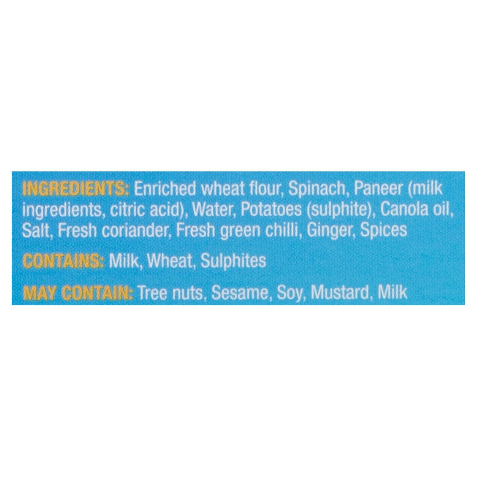 | Ingredients | Enriched wheat flour. Spinach. Paneer (milk ingredients. citric acid). Water. Potatoes (sulphite). Canola oil. Salt. Fresh coriander. Fresh green chilli. Ginger. Spices. |