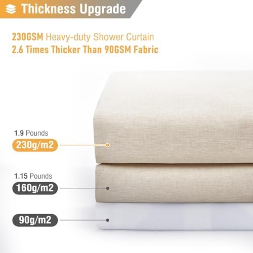 🛁【Linen Texture】- Made of 230GSM premium polyester fabric. which is wrinkle-resistant and non-fading. In addition. the weighted hem design can keep its shape and does not billow like lightweight shower curtains