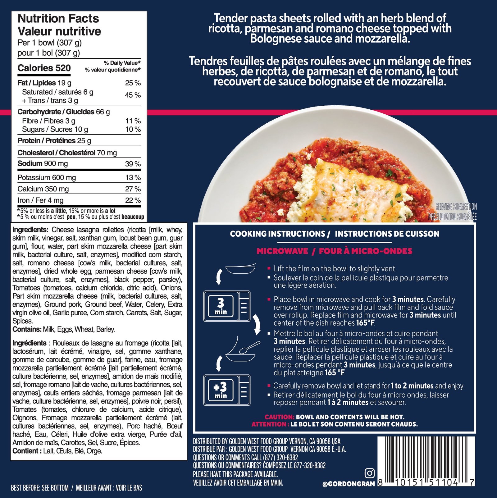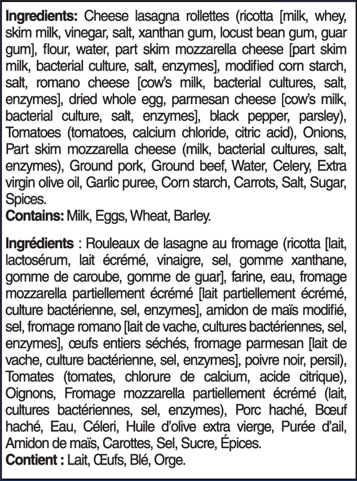 | Ingredients | Cheese Lasagna Rollettes. (Ricotta Cheese [Milk. Whey. Skim Milk. Vinegar. Salt. and Xanthan Gum. Locust Bean Gum. Guar Gum]. Extra Fancy Durum Flour [Wheat Flour. Niacin. Iron. Thiamine Mononitrate. Riboflavin. Folic Acid]. Water. Low Moisture Part Skim Mozzarella Cheese [Pasteurized Part Skim Milk. Cheese Culture. Salt. Enzymes]. Modified Corn Starch. Salt. Romano Cheese [Pasteurized Cow’s Milk. Cheese Cultures. Salt. Enzymes]. Dried Whole Egg. Parmesan Cheese [Pasteurized Cow’s Milk. Cheese Culture. Salt. Enzymes]. Black Pepper. Parsley). Tomatoes (Tomatoes. Calcium Chloride. Citric Acid). Onions. Part Skim Mozzarella Cheese (Pasteurized Milk. Cheese Cultures. Salt. Enzymes). Ground Pork. Ground Beef. Contains 2% or less of: Water. Celery. Extra Virgin Olive Oil. Garlic Puree. Corn Starch. Carrots. Salt. Sugar. Spices. |