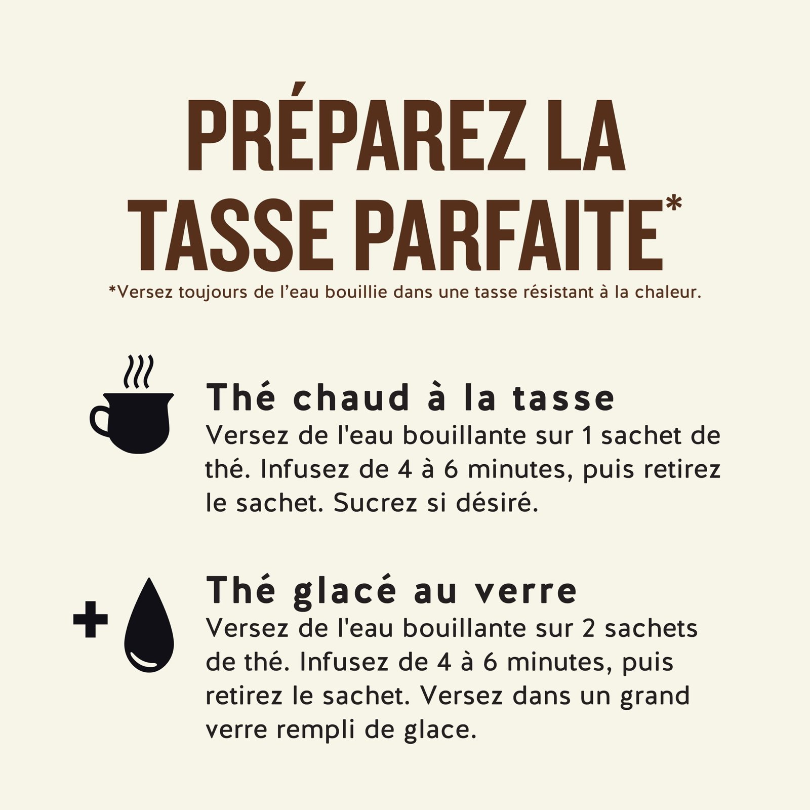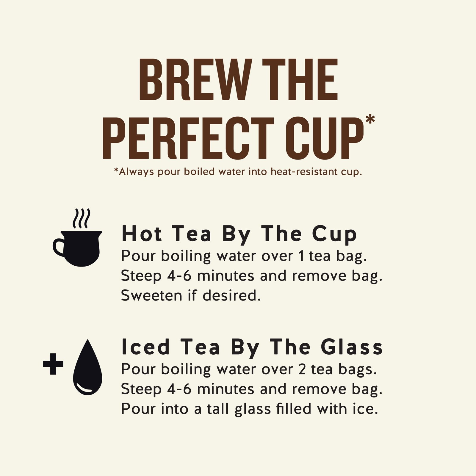InstructionsDIRECTIONS: HOT TEA BY THE CUP Pour freshly boiled water over one tea bag. Steep 4 to 6 minutes and remove tea bag. Sweeten if desired. ICED TEA BY THE PITCHER Pour 2 cups boiling water over four tea bags in a heat-resistant container. Steep 4 to 6 minutes and remove tea bags. If desired. add sweetener while tea is hot. Add 2 cups cold water and chill.