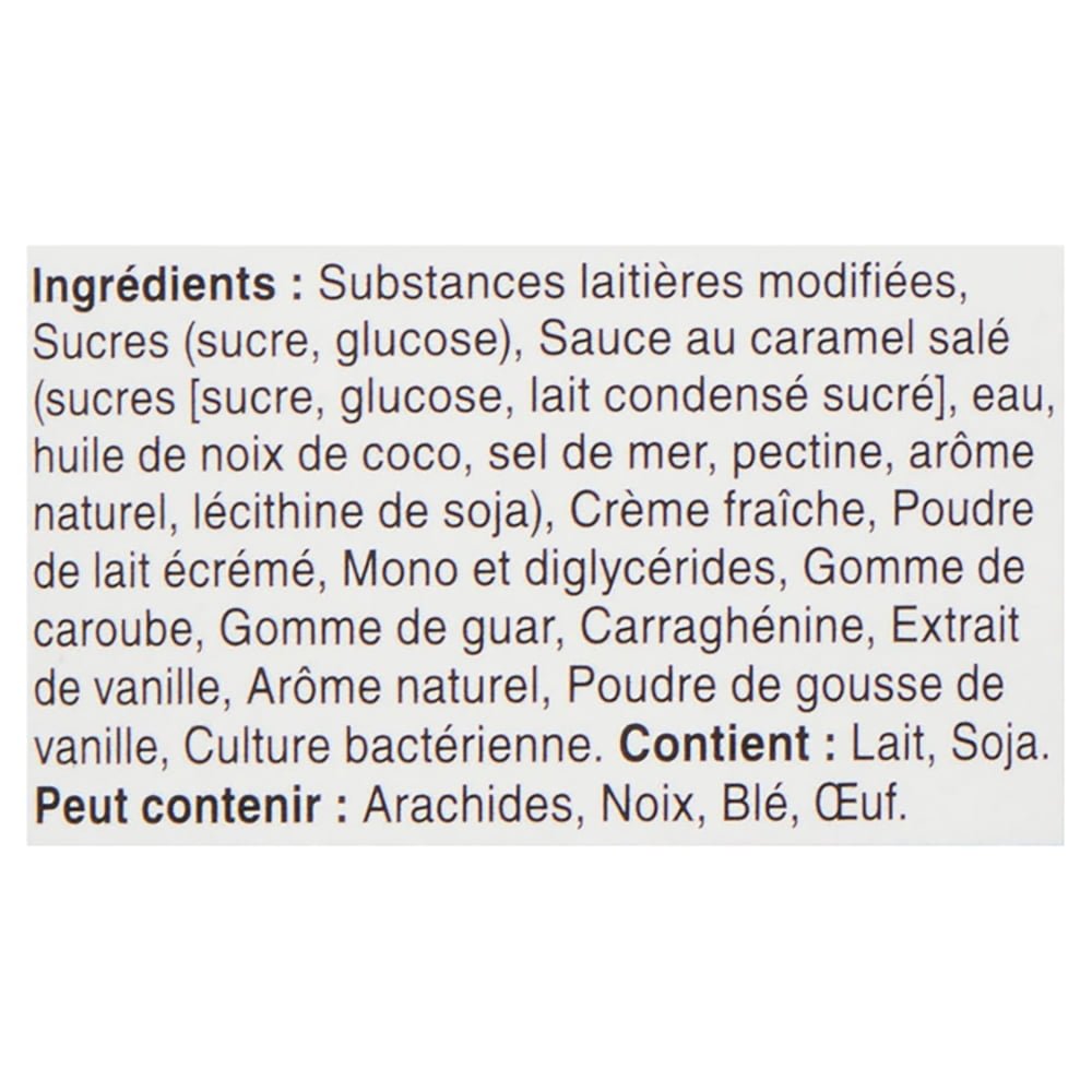 | Ingredients | Modified milk ingredients. Sugars (sugar. glucose). Salty caramel sauce (sugars [sugar. glucose. sweetened condensed milk]. water. coconut oil. sea salt. pectin. natural flavour. soy lecithin). Fresh cream. Skim milk powder. Mono and diglycerides. Carob bean gum. Guar gum. Carrageenan. Vanilla extract. Natural flavour. Vanilla bean powder. Bacterial culture. |