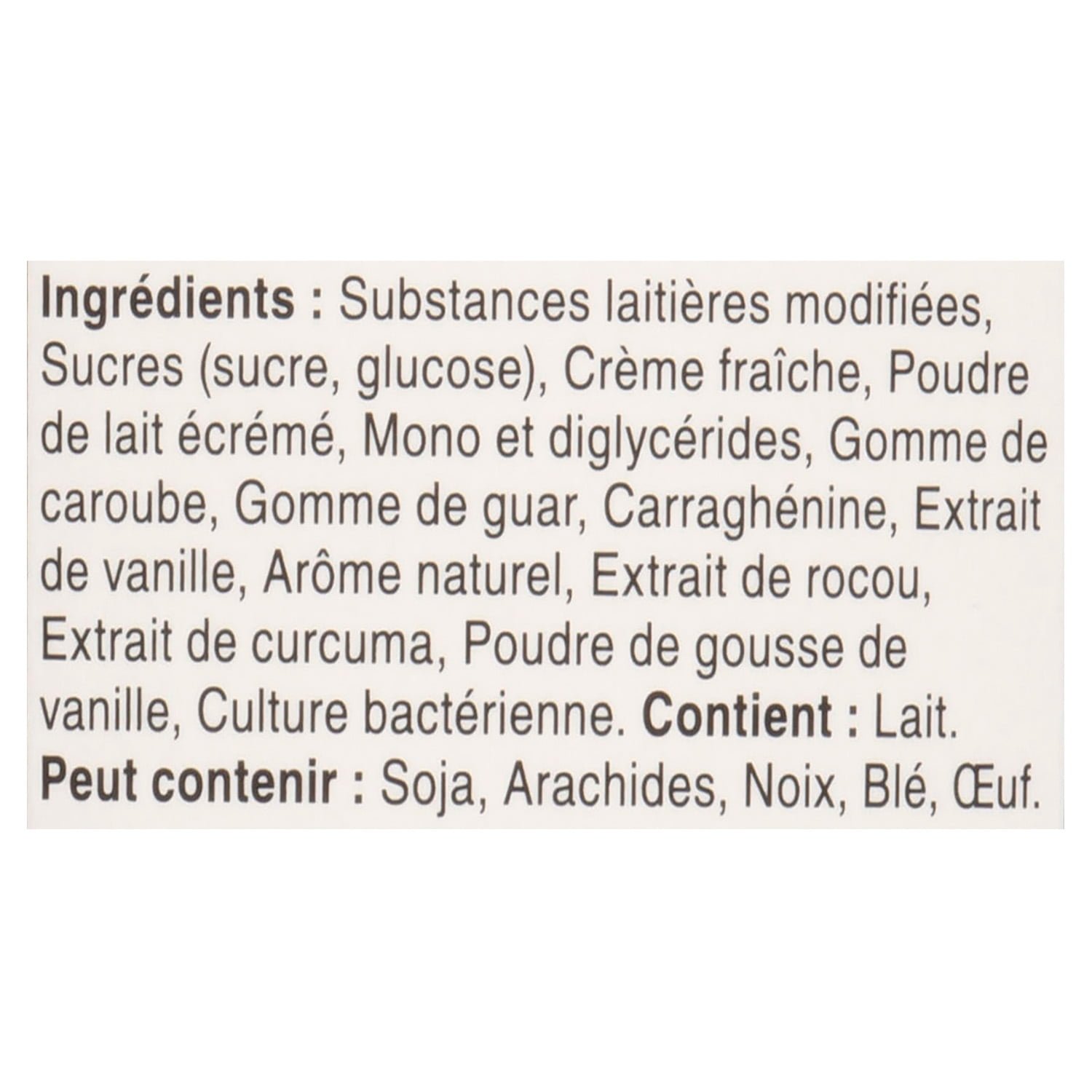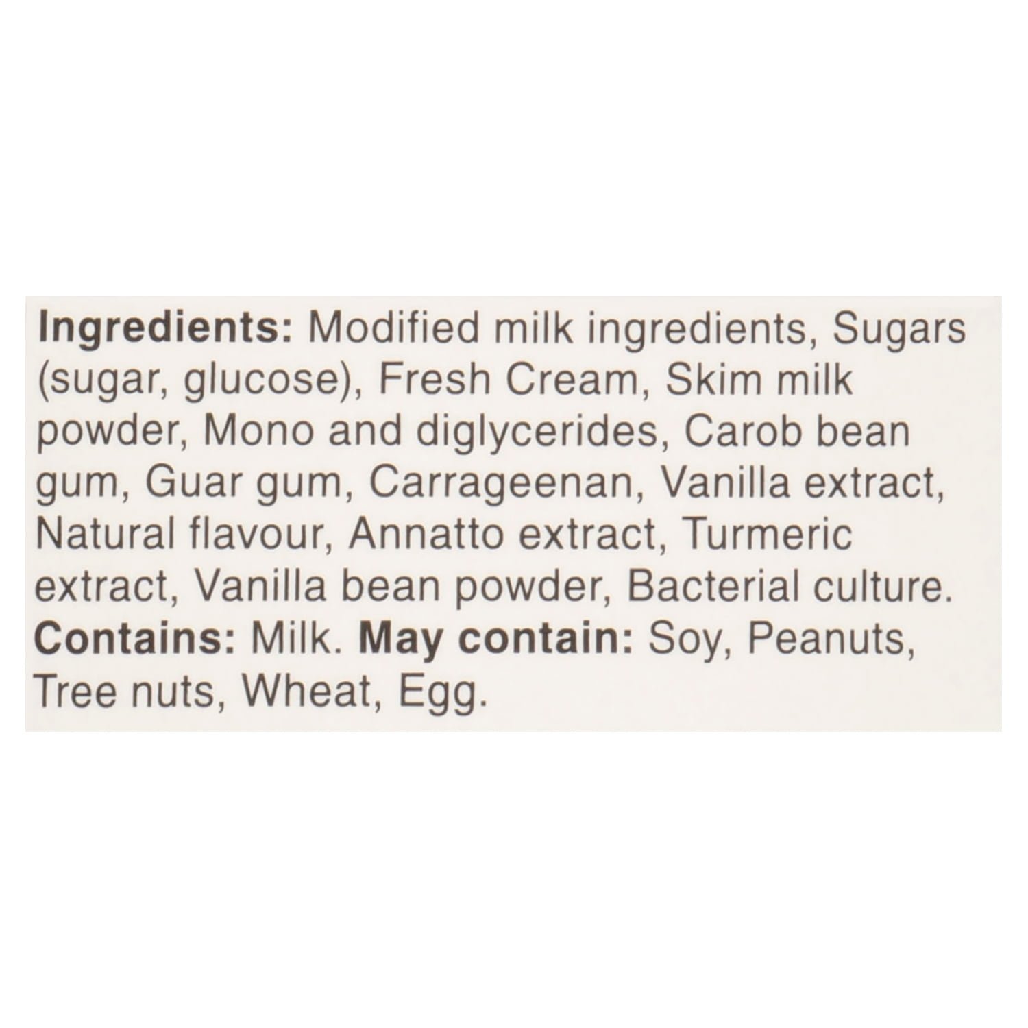 | Ingredients | Modified milk ingredients. Sugars (sugar. glucose). Fresh Cream. French vanilla flavour base (sugars [glucose. sugar]. liquid egg yolk. water. natural flavour. annatto extract. turmeric extract. potassium sorbate). Skim milk powder. Mono and diglycerides. Carob bean gum. Guar gum. Carrageenan. Vanilla extract. Natural flavour. Vanilla bean powder. Bacterial culture. |