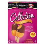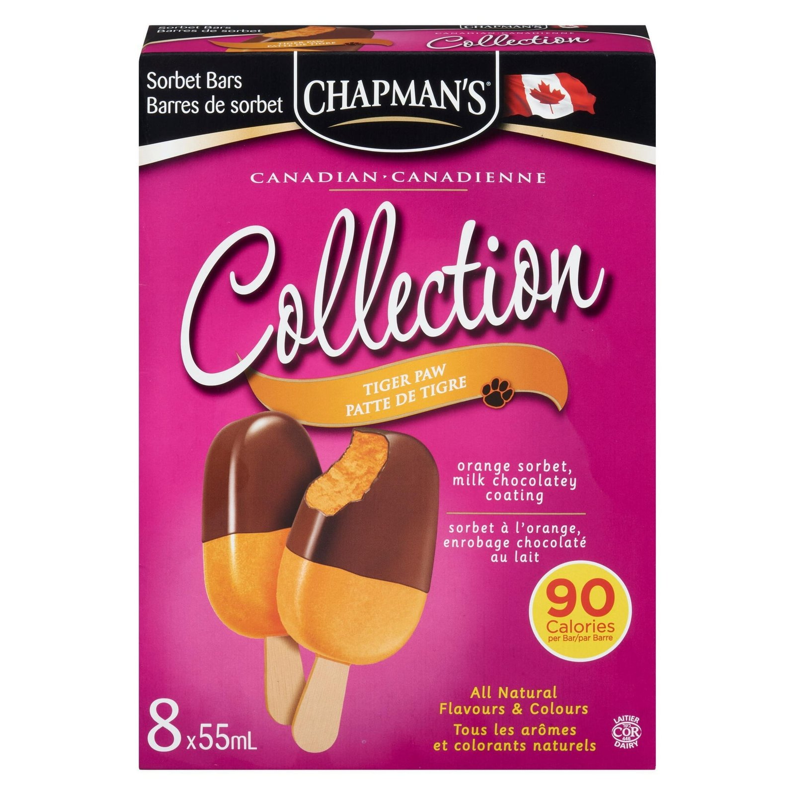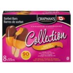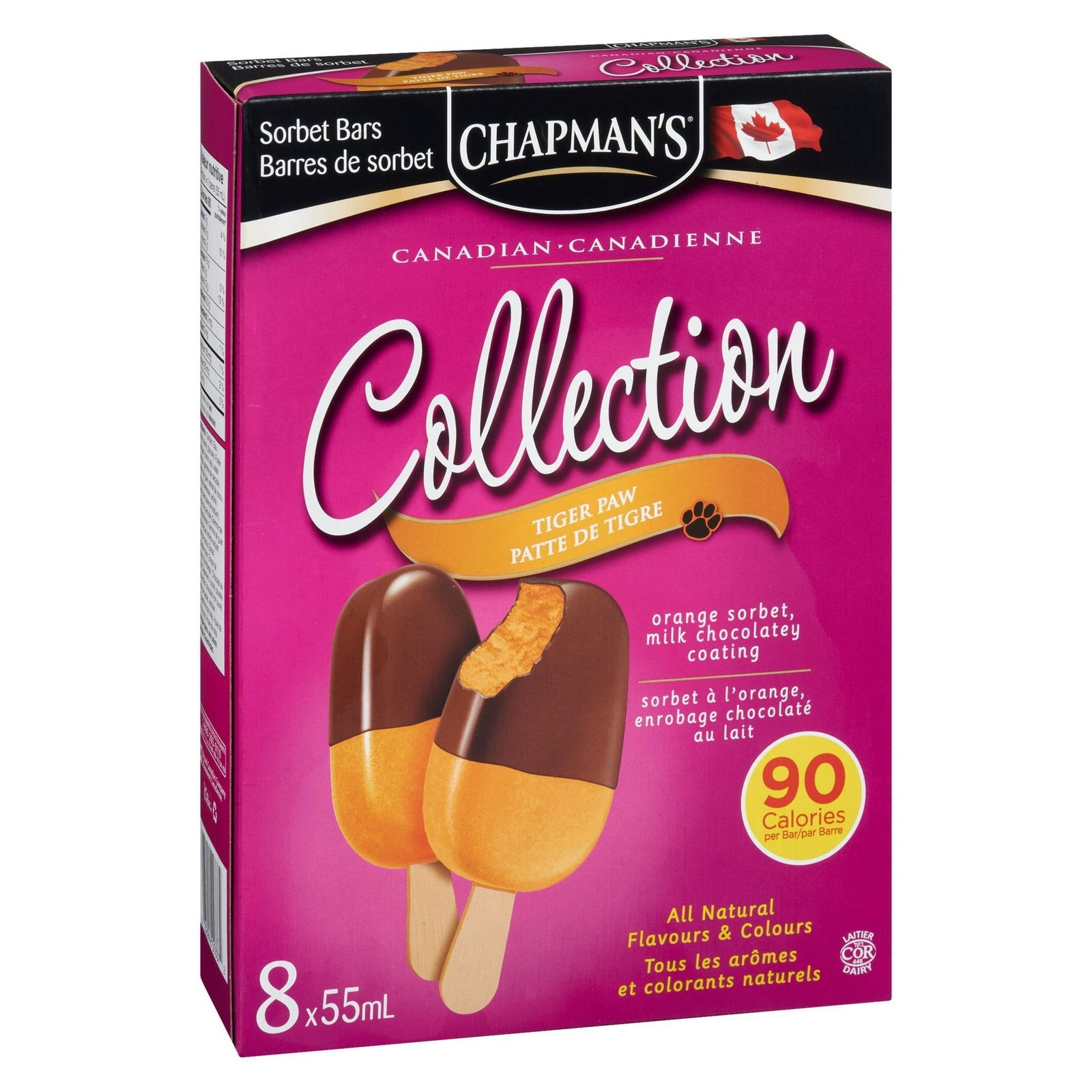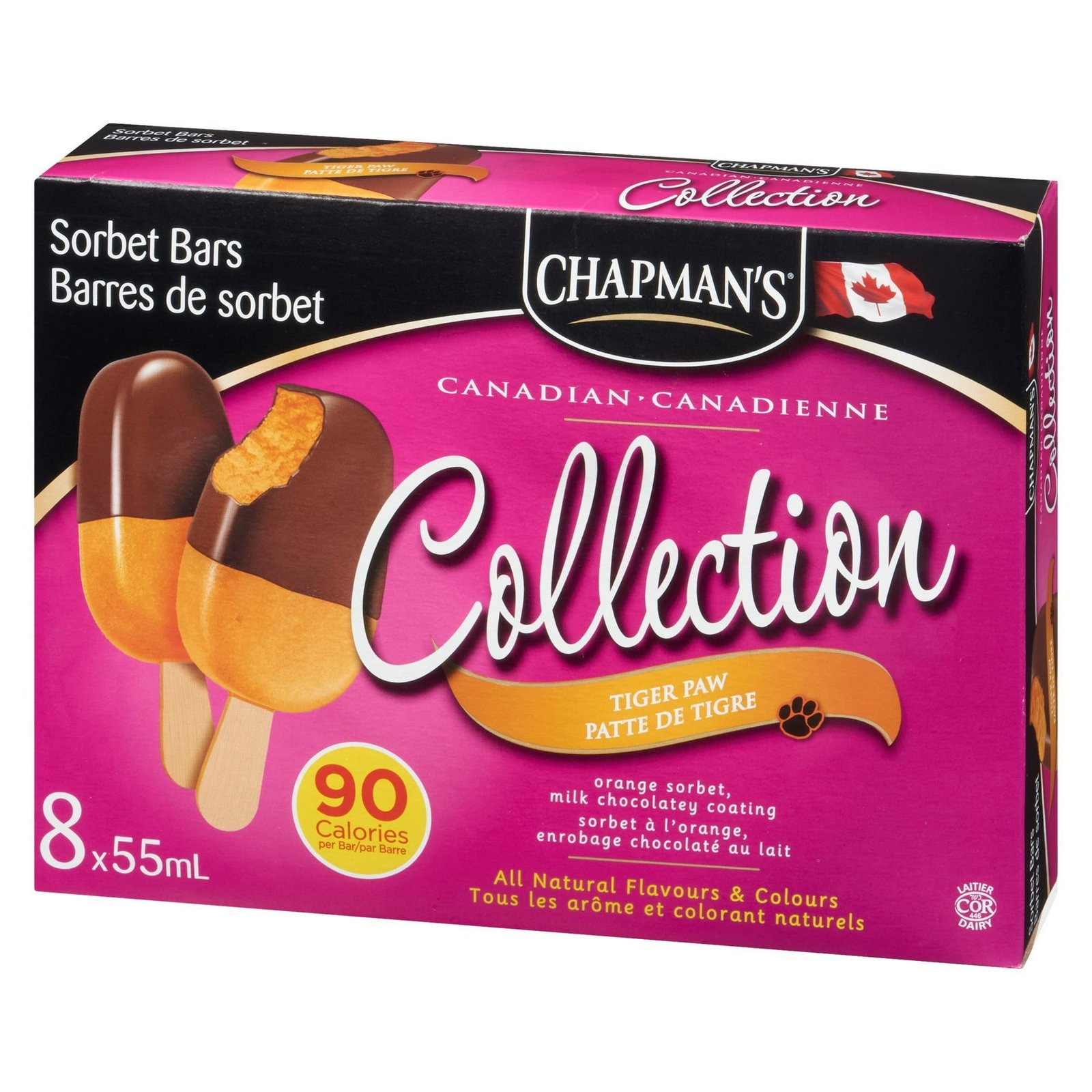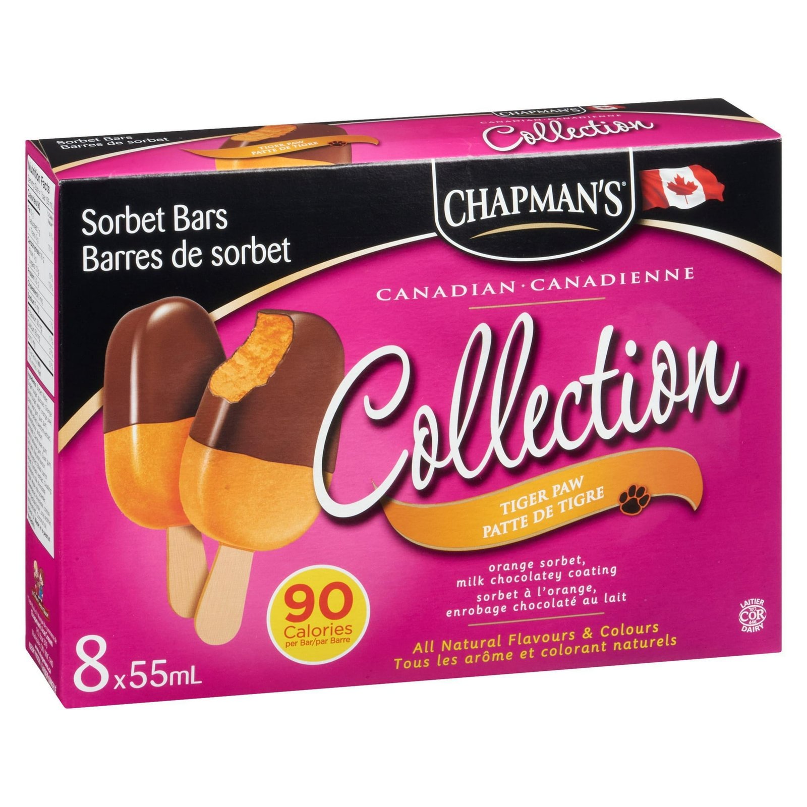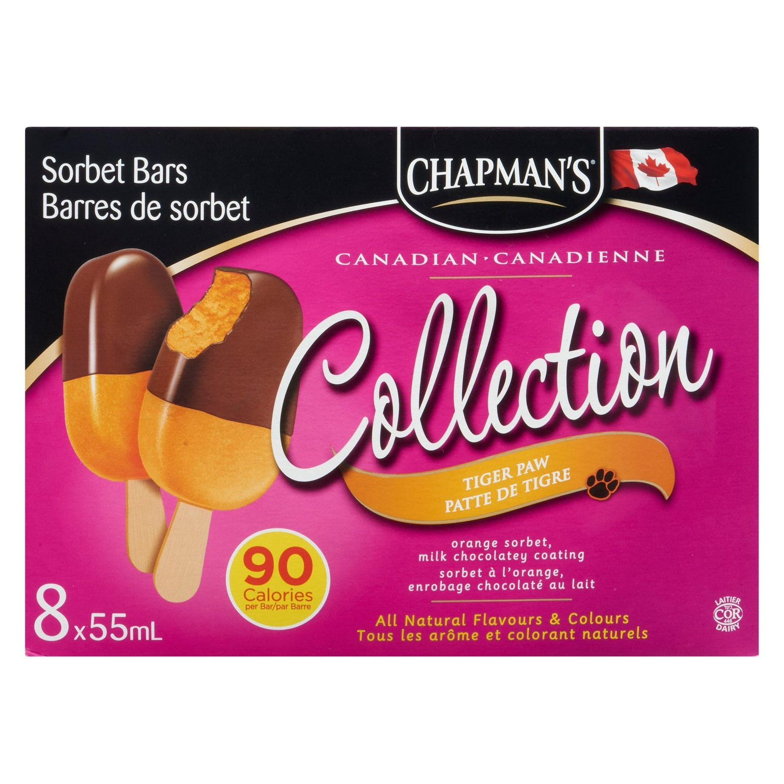 | Ingredients | Sorbet: Water. Sugars (sugar. glucose). Orange purée (sugar. water. orange peel. carob bean gum. guar gum. annatto extract. beetroot extract. natural flavour. sodium benzoate). Carob bean gum. Methyl cellulose gum. Guar gum. Citric acid. Natural flavour. Annatto extract. Black carrot extract. Turmeric extract. Coating: Chapman’s milk chocolate (sugar. whole milk powder. unsweetened chocolate. cocoa butter. lactose [milk]. soy lecithin. vanilla extract). Coconut oil. Soybean oil. |