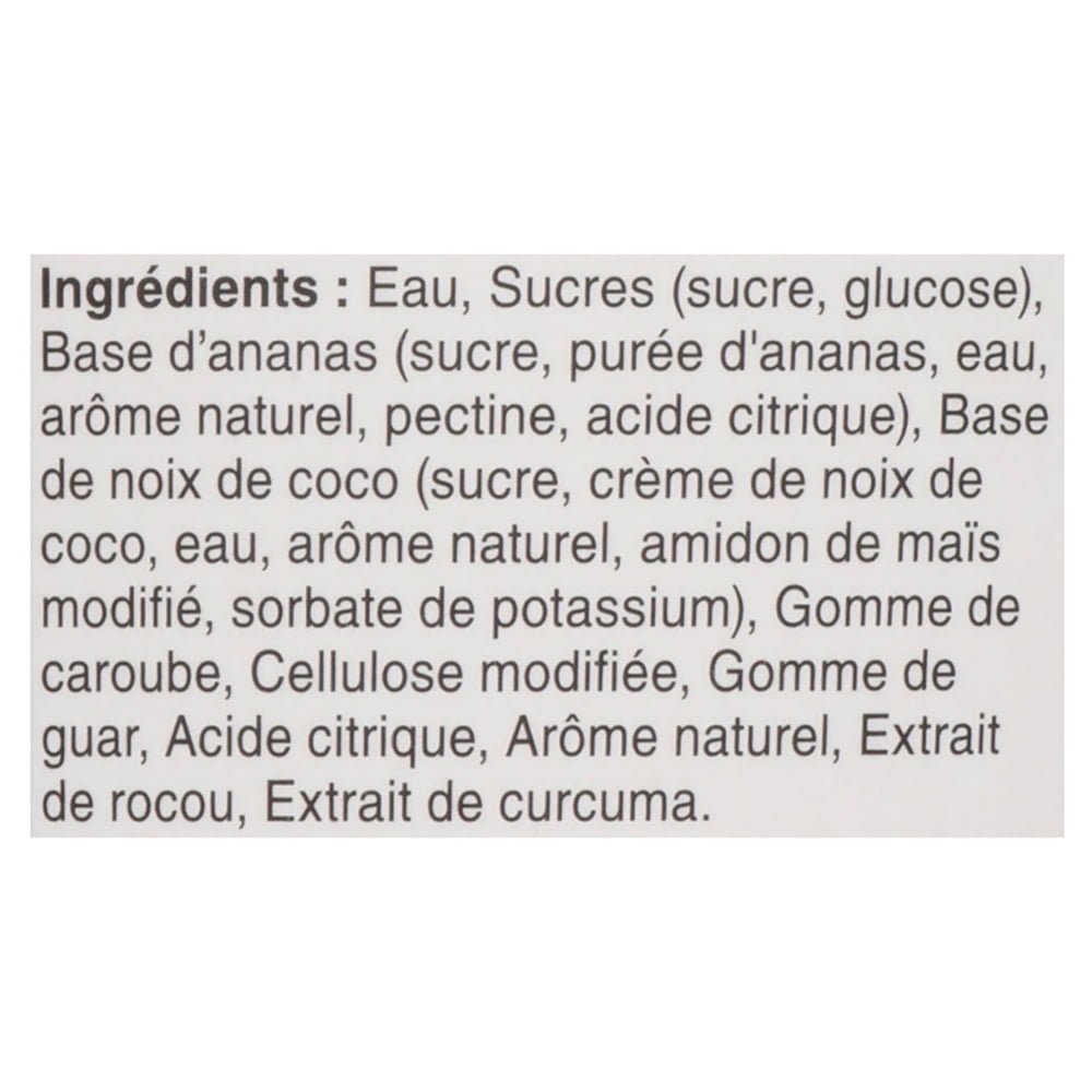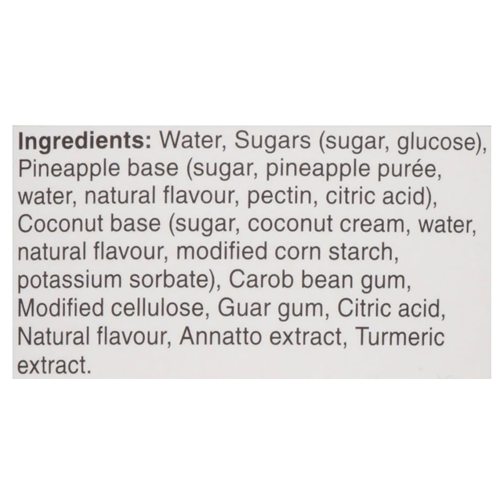 IngredientsWater. Sugars (sugar. glucose). Pineapple base (sugar. pineapple purée. water. natural flavour. pectin. citric acid). Coconut base (sugar. coconut cream. water. natural flavour. modified corn starch. potassium sorbate). Carob bean gum. Modified cellulose. Guar gum. Citric acid. Natural flavour. Annatto extract. Turmeric extract.