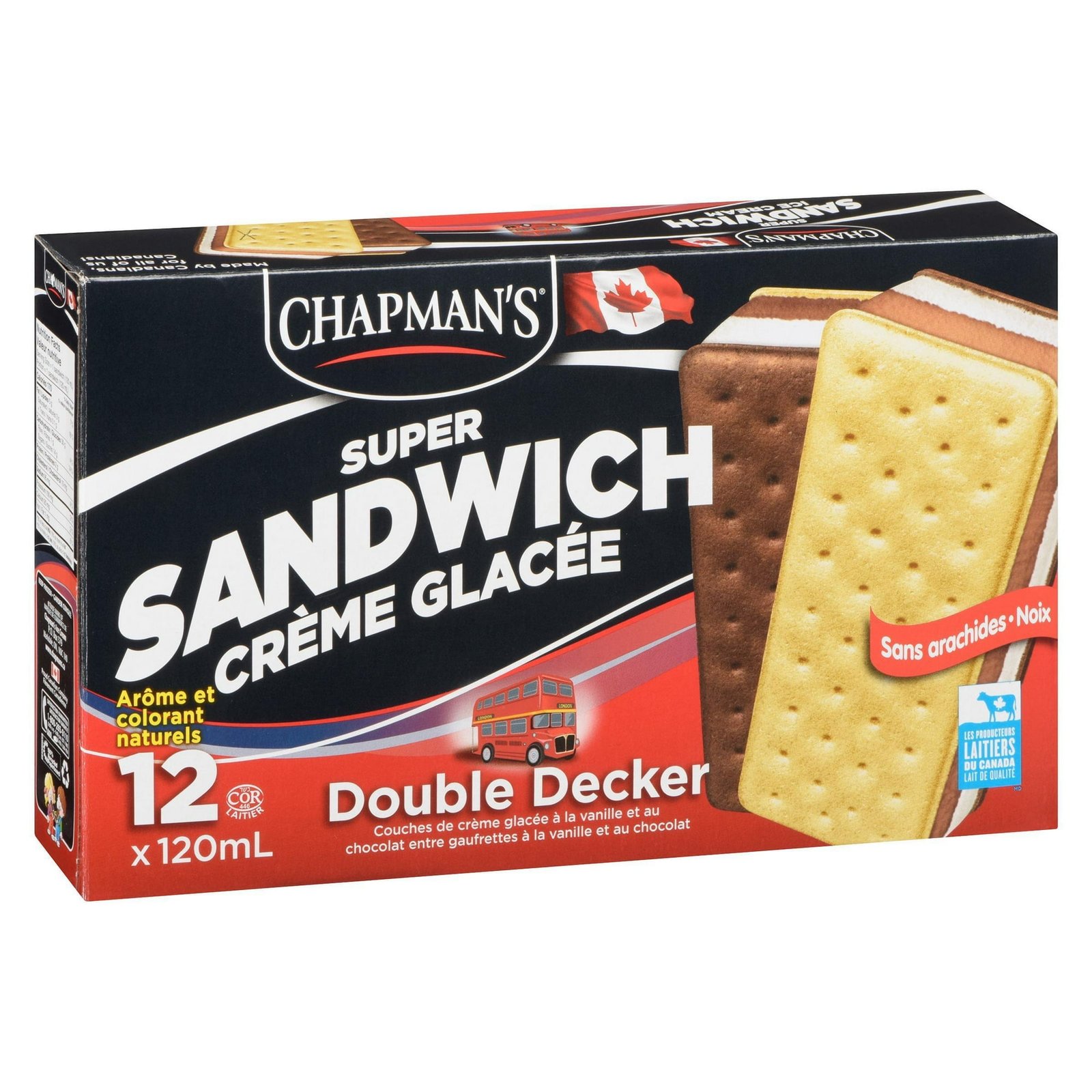 | Ingredients | Ice cream: Sugars (sugar. glucose). Fresh cream. Modified milk ingredients. Cocoa. Mono and diglycerides. Carob bean gum. Cellulose gum. Guar gum. Carrageenan. Vanilla extract. Natural flavour. Chocolate wafer: Enriched wheat flour. Sugars (sugar. glucose-fructose. dextrose). Caramel colour. Palm oil. Corn flour. Cocoa. Modified corn starch. Baking soda. Salt. Mono and diglycerides. Soy lecithin. Vanilla wafer: Enriched wheat flour. Sugars (sugar. glucose-fructose). Palm and soybean oil. Modified corn starch. Baking soda. Salt. Soy lecithin. Natural flavour. |
