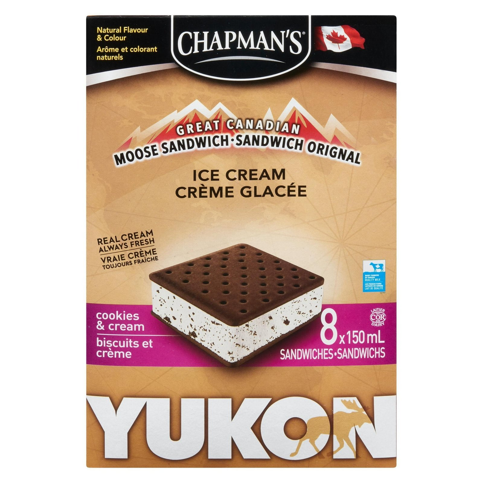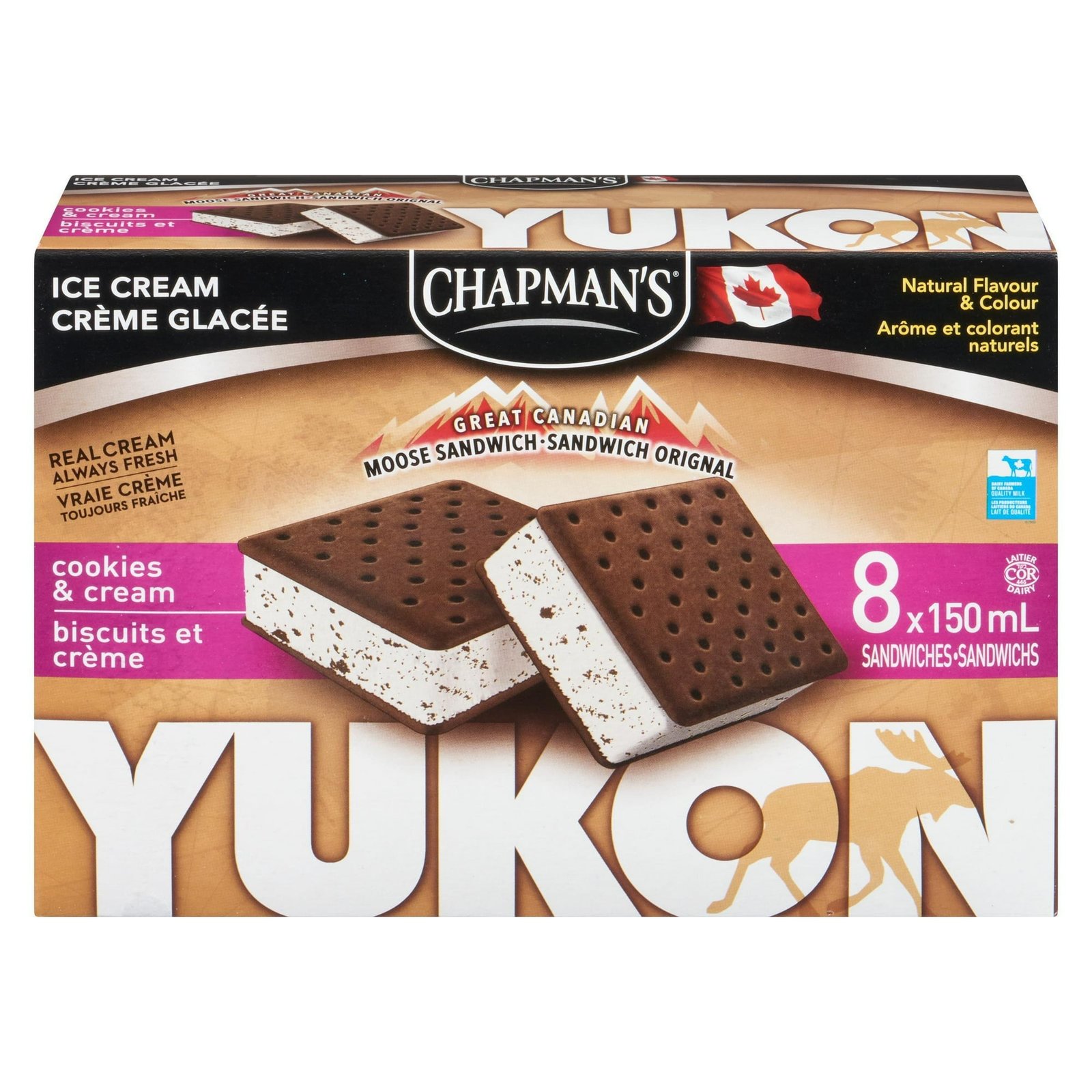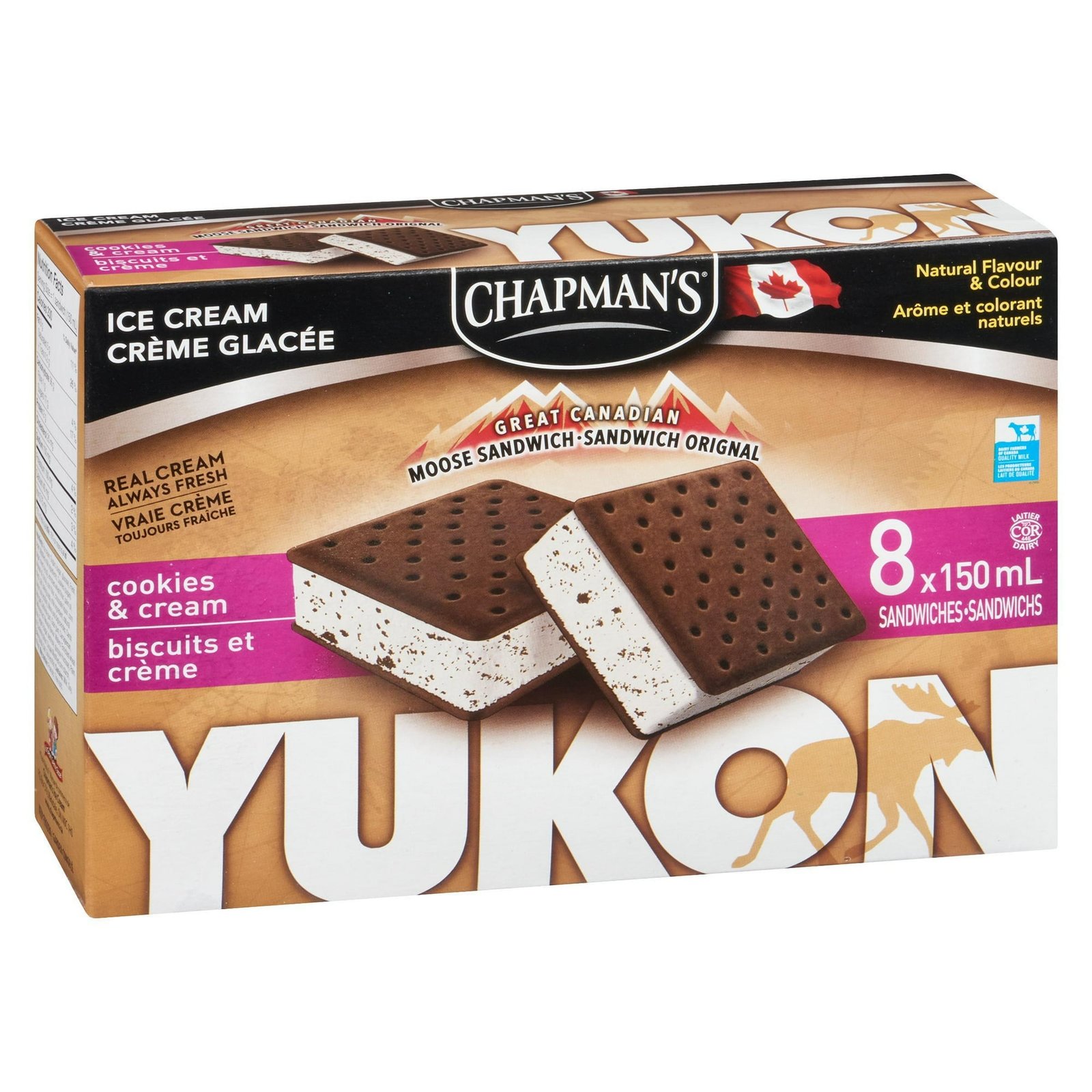 | Ingredients | Ice cream: Sugars (sugar. glucose). Fresh cream. Modified milk ingredients. Cookies (sugars [sugar. invert syrup]. enriched wheat flour. palm oil. soybean oil. cocoa. corn flour. chocolate liquor. corn starch. salt. baking soda. milk ingredient. natural flavour. soy lecithin). Mono and diglycerides. Carob bean gum. Cellulose gum. Guar gum. Carrageenan. Vanilla extract. Natural flavour. Wafers: Enriched wheat flour. Sugars (sugar. dextrose. glucose-fructose). Palm oil. Caramel colour. Cocoa. Modified corn starch. Baking soda. Salt. Soy lecithin. |