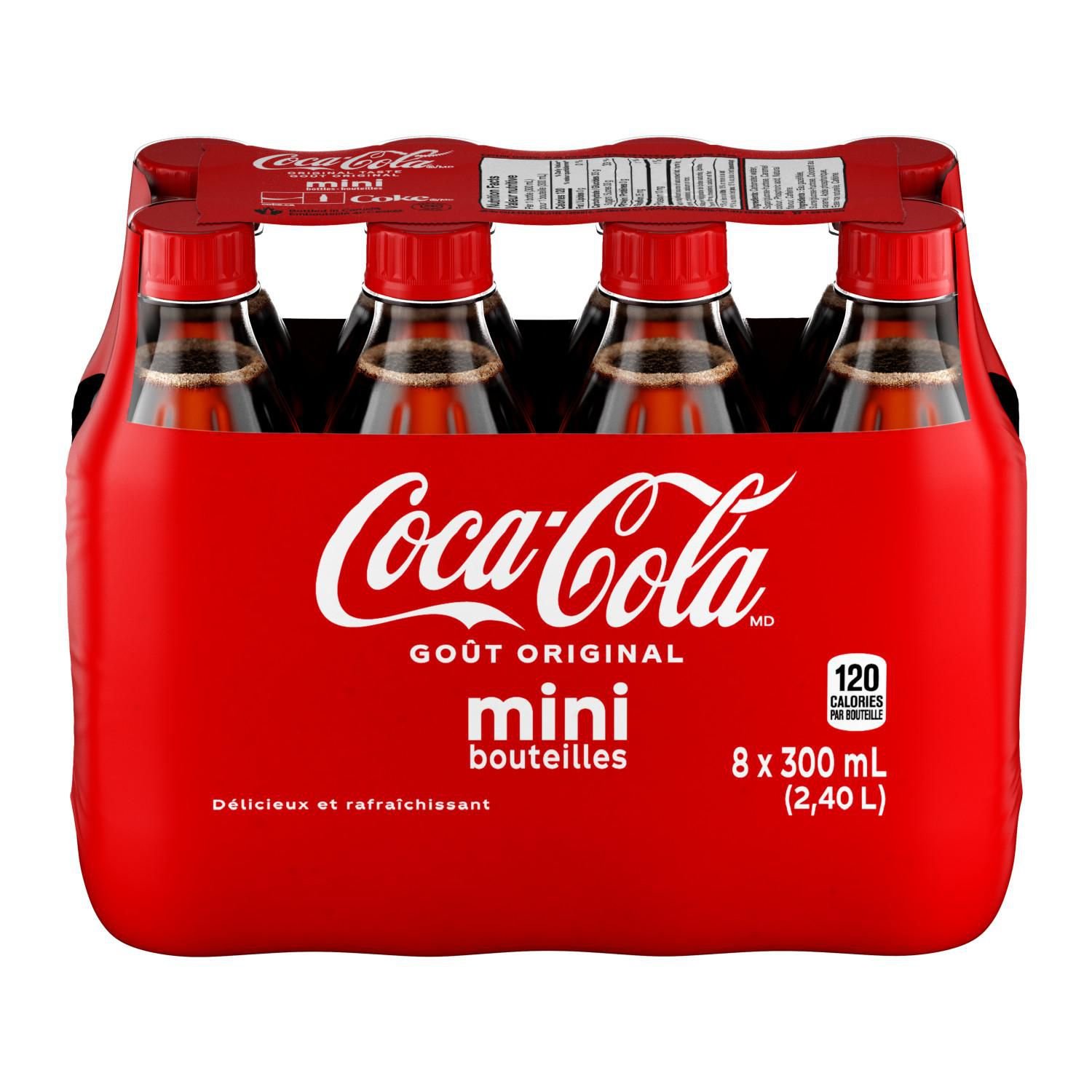 | Fabric Property | 8 mini bottles of Coca-Cola — the refreshing. crisp taste you know and love Great taste since 1886 34 mg caffeine in each 355 mL serving 300 mL in each mini bottle This carbonated beverage is best enjoyed ice-cold for maximum refreshment |