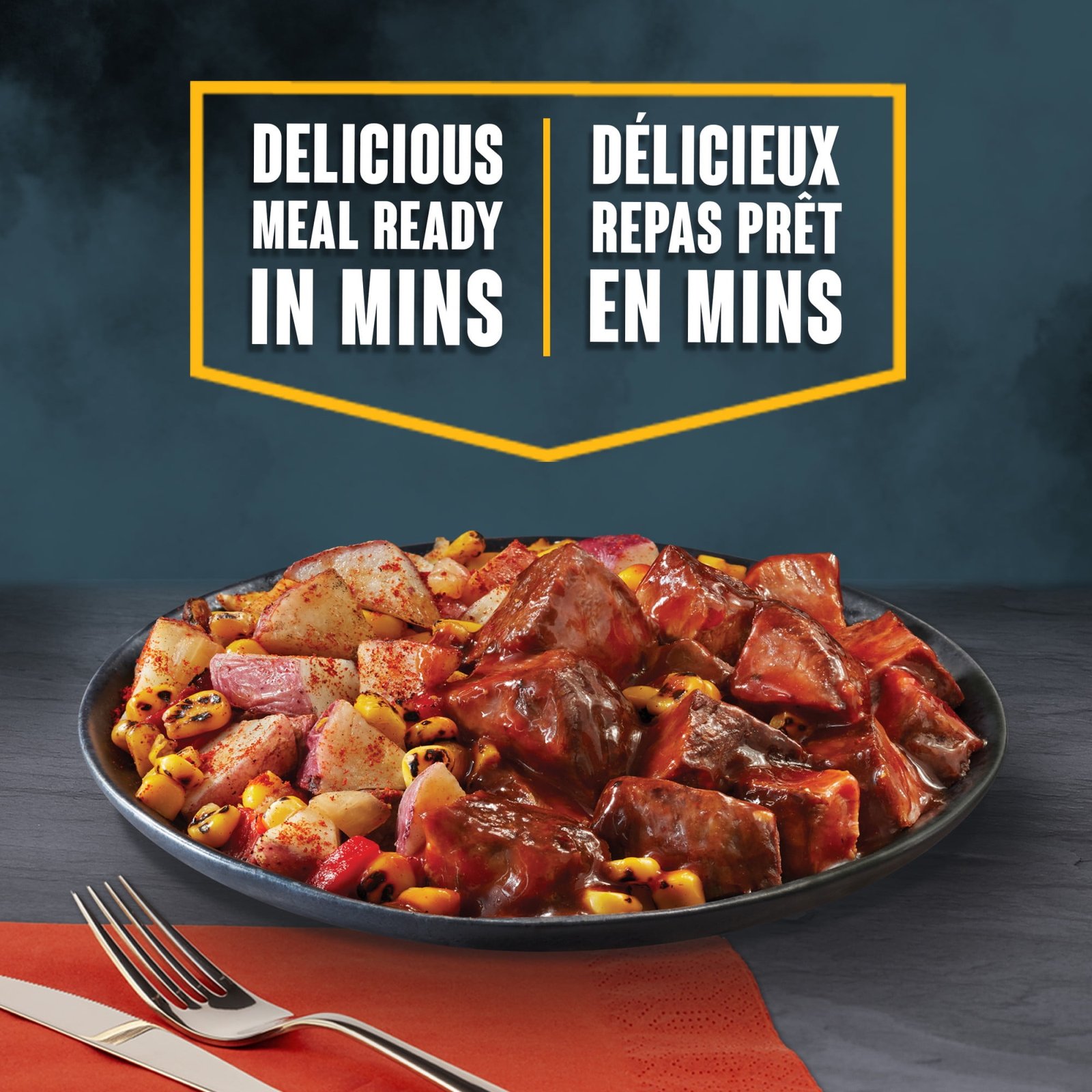 IngredientsFULLY COOKED SEASONED ANGUS BEEF POT ROAST (BEEF. WATER. DEXTROSE. SALT. MODIFIED FOOD STARCH. CONCENTRATED BEEF STOCK. SODIUM PHOSPHATE. CARAMEL COLOUR. SPICE EXTRACTIVES). POTATOES. FIRE ROASTED CORN. SUGAR. WATER. TOMATO PUREE. VINEGAR. ONIONS. BLACKSTRAP MOLASSES. SALT. SPICES. FIRE ROASTED RED BELL PEPPERS. MODIFIED CORN STARCH. ONION POWDER. SOYBEAN OIL. GARLIC POWDER. SEASONINGS (ANCHOVIES [FISH]). NATURAL SMOKE FLAVOUR. MUSTARD FLOUR. XANTHAN GUM. NATURAL FLAVOUR. POTASSIUM CHLORIDE.