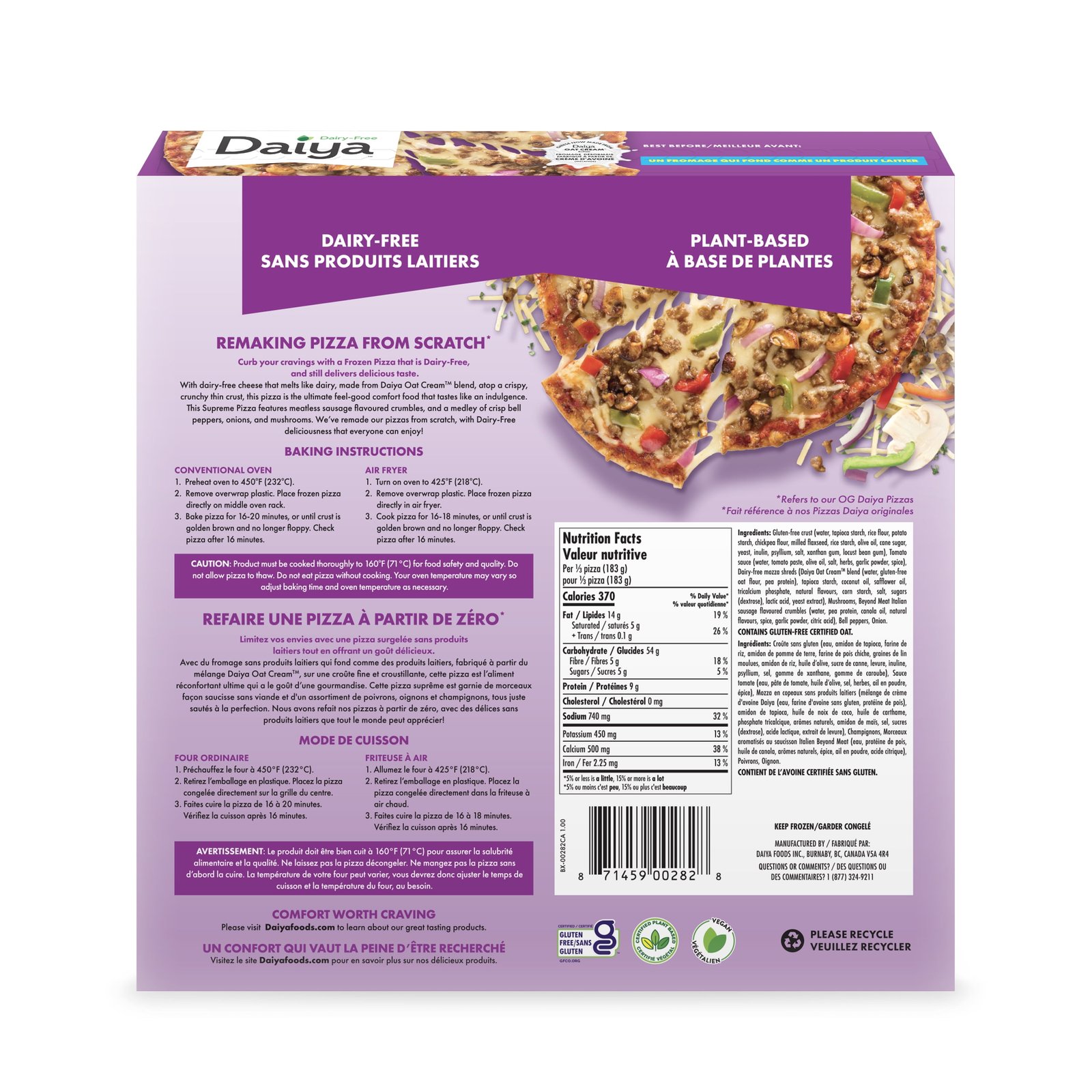 | Ingredients | Gluten-free crust (water. tapioca starch. rice flour. potato starch. chickpea flour. milled flaxseed. rice starch. olive oil. cane sugar. yeast. inulin. psyllium. salt. xanthan gum. locust bean gum). Tomato sauce (water. tomato paste. olive oil. salt. herbs. garlic powder. spice). Dairy-free mozza shreds (Daiya Oat CreamTM blend (water. gluten-free oat flour. pea protein). tapioca starch. coconut oil. safflower oil. tricalcium phosphate. natural flavours. corn starch. salt. sugars (dextrose). lactic acid. yeast extract). Mushrooms. Beyond Meat Italian Sausage Flavoured Crumbles (water. pea protein. canola oil. natural flavours. spice. garlic powder. citric acid). Bell peppers. Onion. |