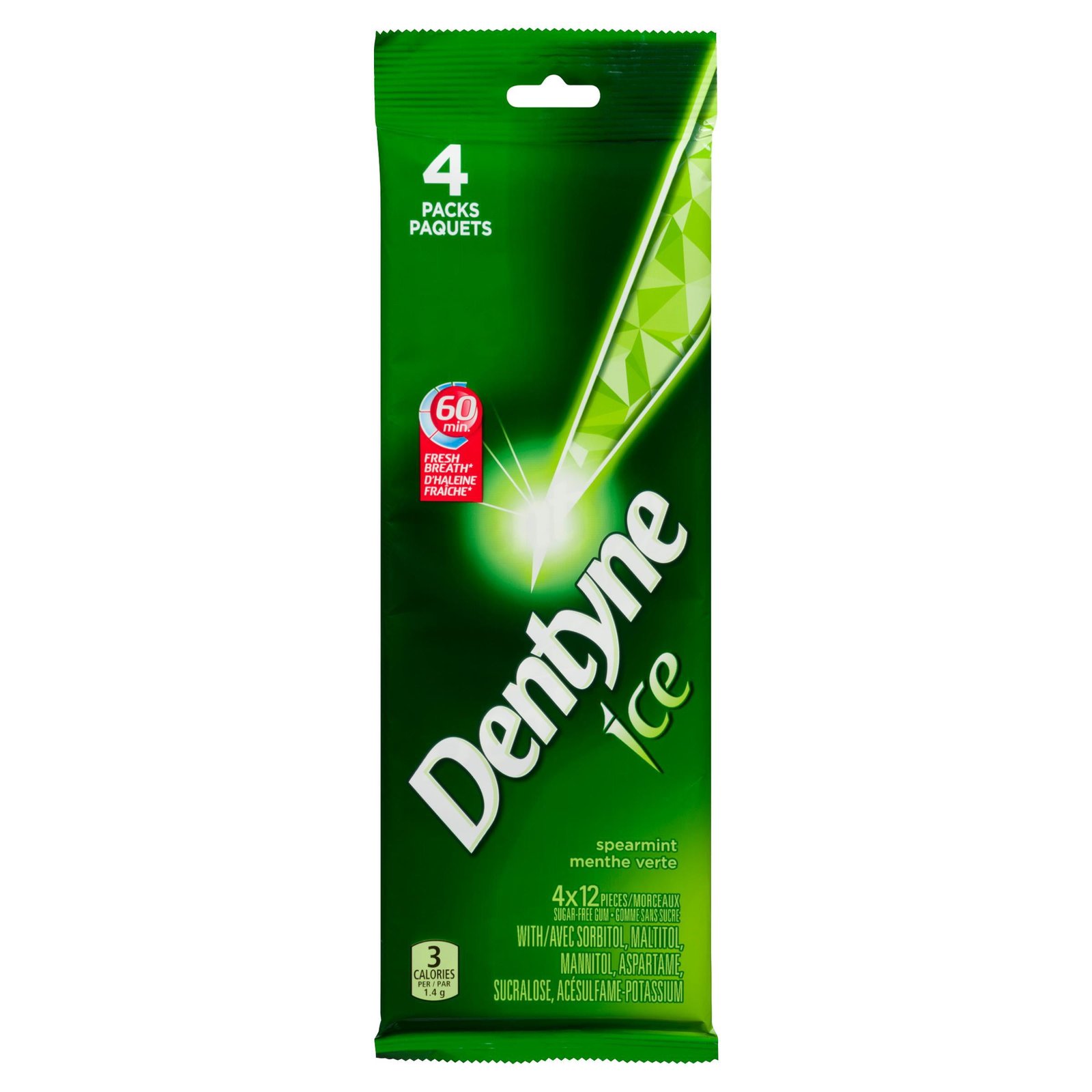 | Fabric Property | • Stay Icy Cool in the Face of your Daily Adventures with Dentyne Ice Sugar-Free Gum! • Dentyne Ice has a bold. icy flavour that keeps breath fresh for up to 60 minutes after chewing. • With 35% fewer calories than sugared gum. Dentyne Ice is the smart way to stay fresh and confident in the situations that life brings to you • Keep Dentyne Ice sugar free chewing gum in your pocket. desk or car for a quick breath freshener • This order includes four packs of Spearmint Dentyne Ice Gum. |