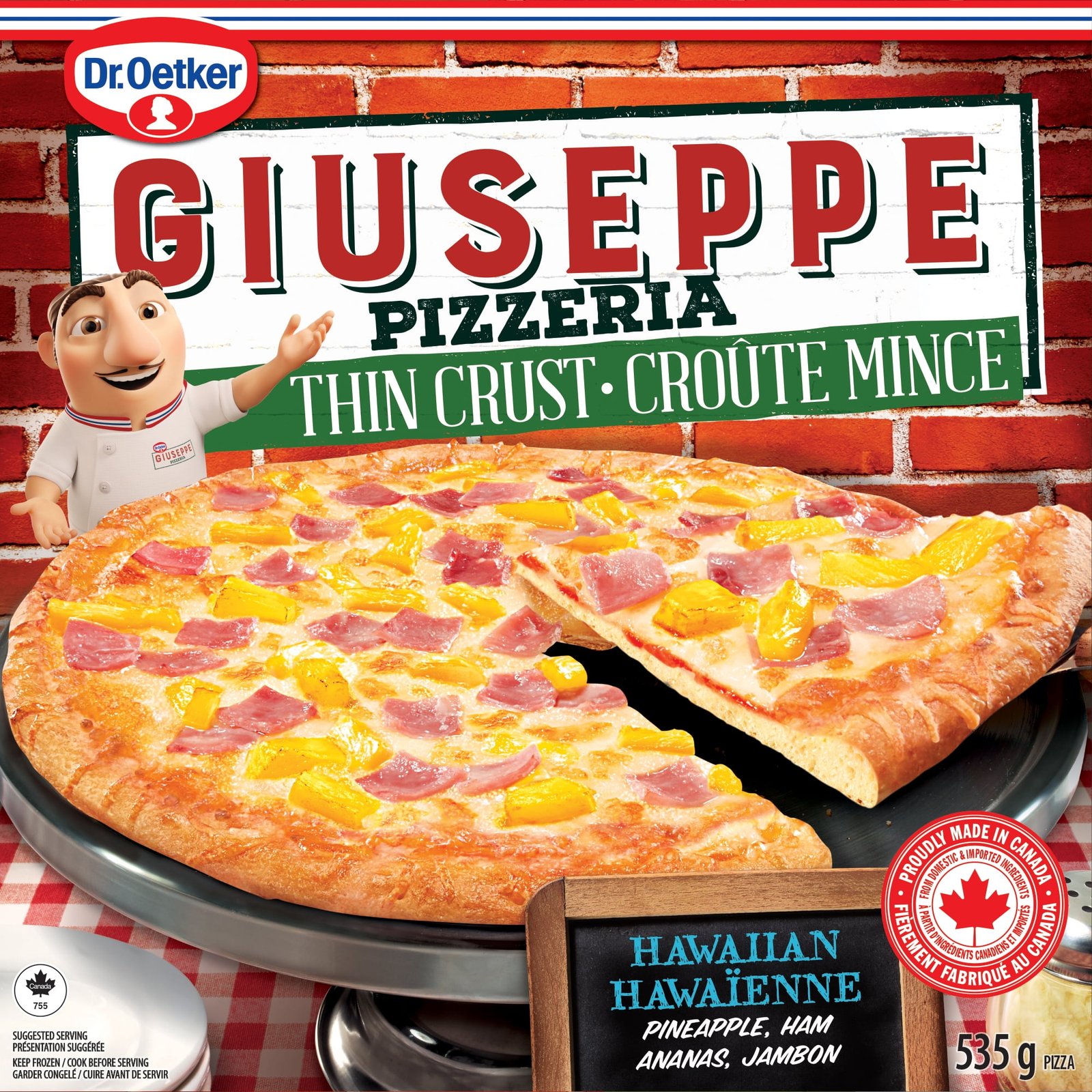 Dr. Oetker Giuseppe Pizzeria Thin Crust Hawaiian is made with real pizzeria inspired tomato sauce and mozzarella and finished with ham and pineapple.