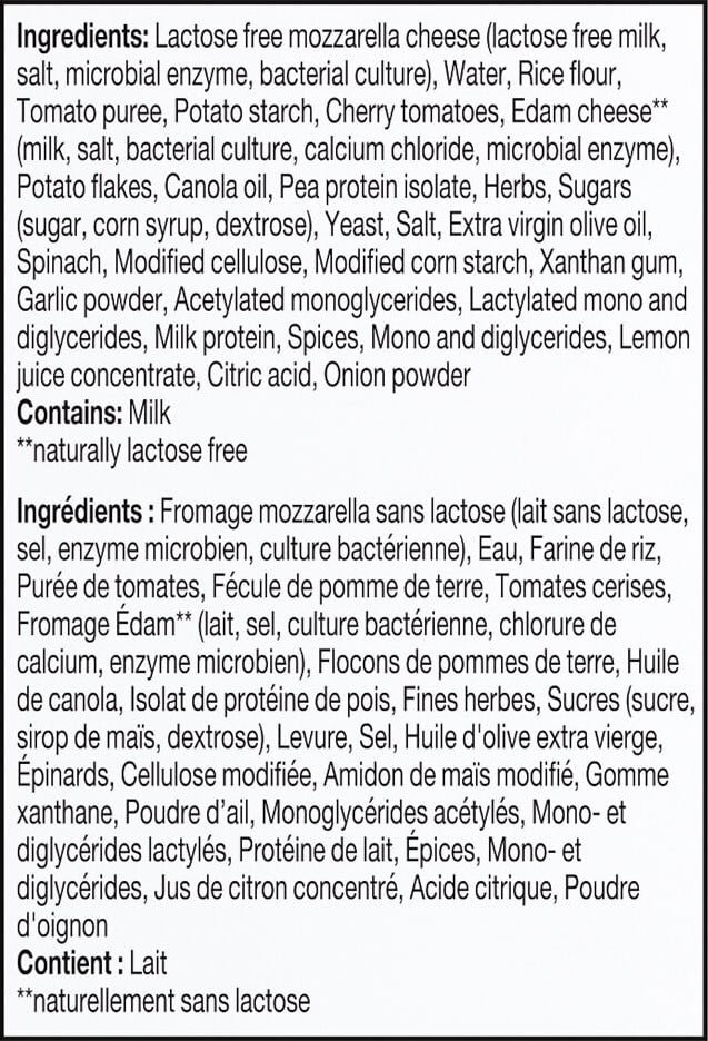 IngredientsCrust: Water. rice flour. potato starch. potato flakes. pea protein isolate. canola oil. yeast. sugar. salt. modified cellulose. xanthan gum. corn syrup. acetylated monoglycerides. lactylated mono and diglycerides. milk ingredientsToppings: Lactose free mozzarella cheese (lactose free milk. salt. microbial enzyme. bacterial culture). cherry tomatoes. herbsSauces: Tomato puree. water. canola oil. herbs. olive oil. spinach. sugar. modified corn starch. salt. garlic powder. spices. mono and diglycerides. dextrose. lemon juice (water. concentrated lemon juice). onion powder. citric acidCheeses: Edam cheese** (milk. salt. bacterial culture. calcium chloride. microbial enzyme). lactose free mozzarella cheese (lactose free milk. salt. microbial enzyme. bacterial culture)