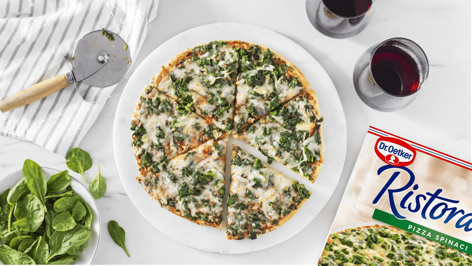 Experience passion on your palate with Ristorante! Thin & crispy Italian-style pizza. Dr. Oetker Ristorante Spinaci thin crust pizza is topped with delicious spinach. edam cheese and mozzarella cheese. over our hearty garlic sauce. Enjoy delicious pizza moments with Dr Oetker!
