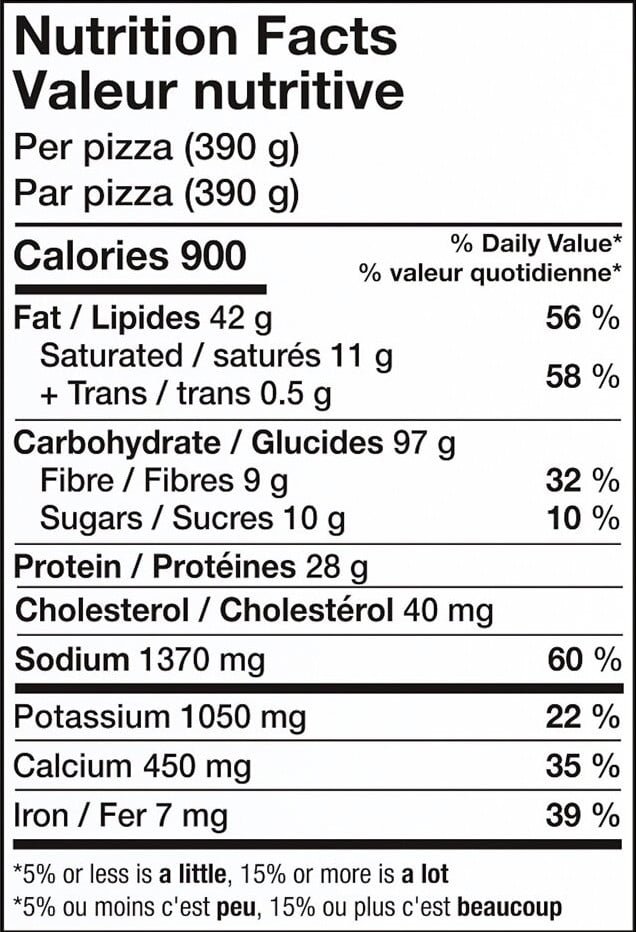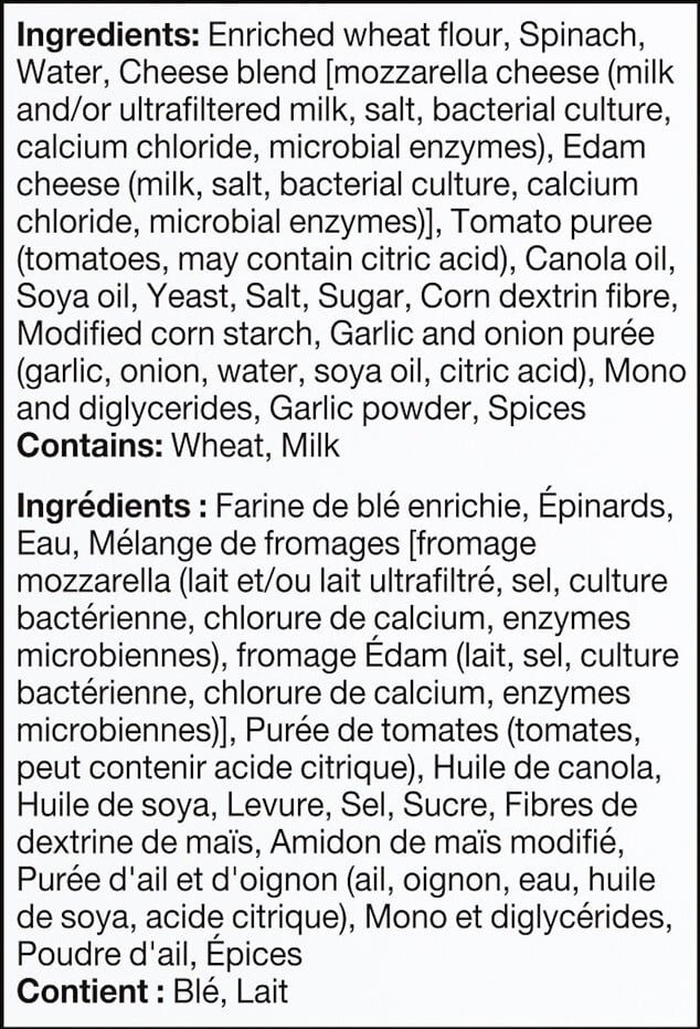 | Ingredients | Crust: Enriched wheat flour. water. vegetable oil. yeast. salt. sugar. Sauce: Tomato puree. water. vegetable oil. salt. sugar. modified corn starch. modified palm oil. garlic powder. hydrolyzed corn protein. mono and diglycerides. dextrose. spices. caramel colour. Toppings: Spinach. Cheeses: Edam and mozzarella cheese (milk. bacterial culture. salt. calcium chloride. microbial enzyme) |