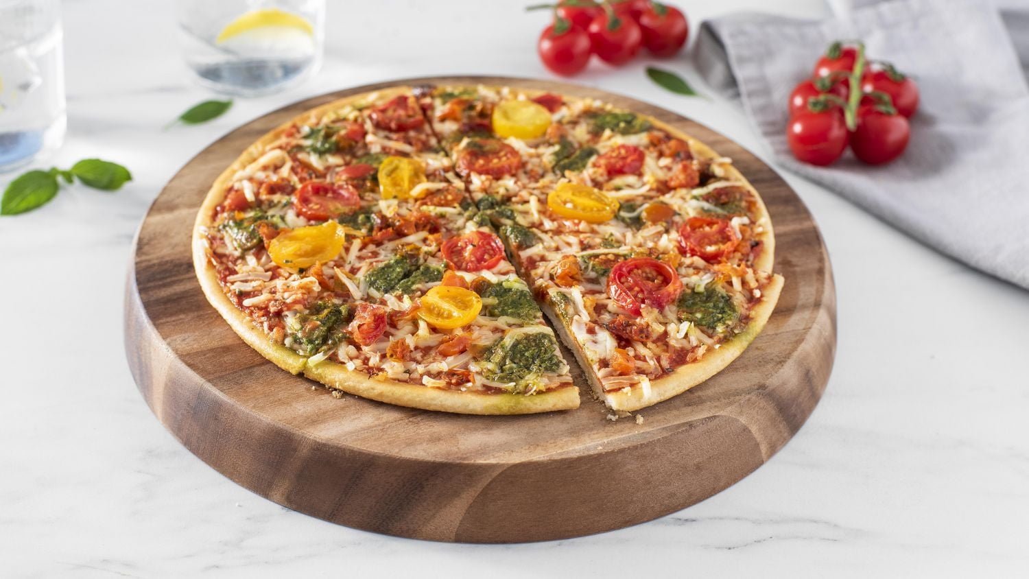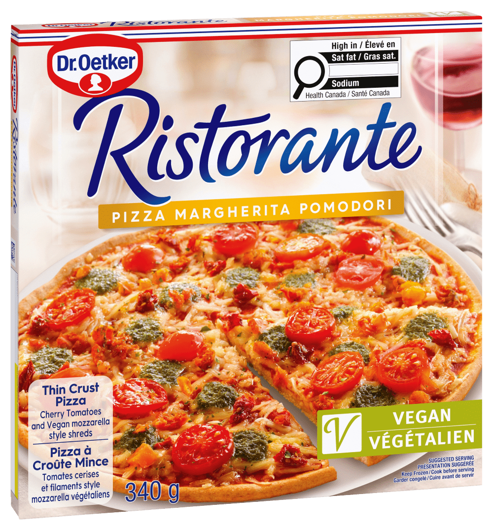 Dr. Oetker Ristorante Vegan Margherita Pomodori thin crust pizza is topped with cherry tomatoes. marinated tomatoes. grated vegan coconut oil based cheese and basil pesto. Over our tomato signature pizzeria style sauce.