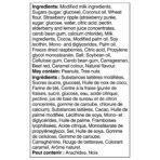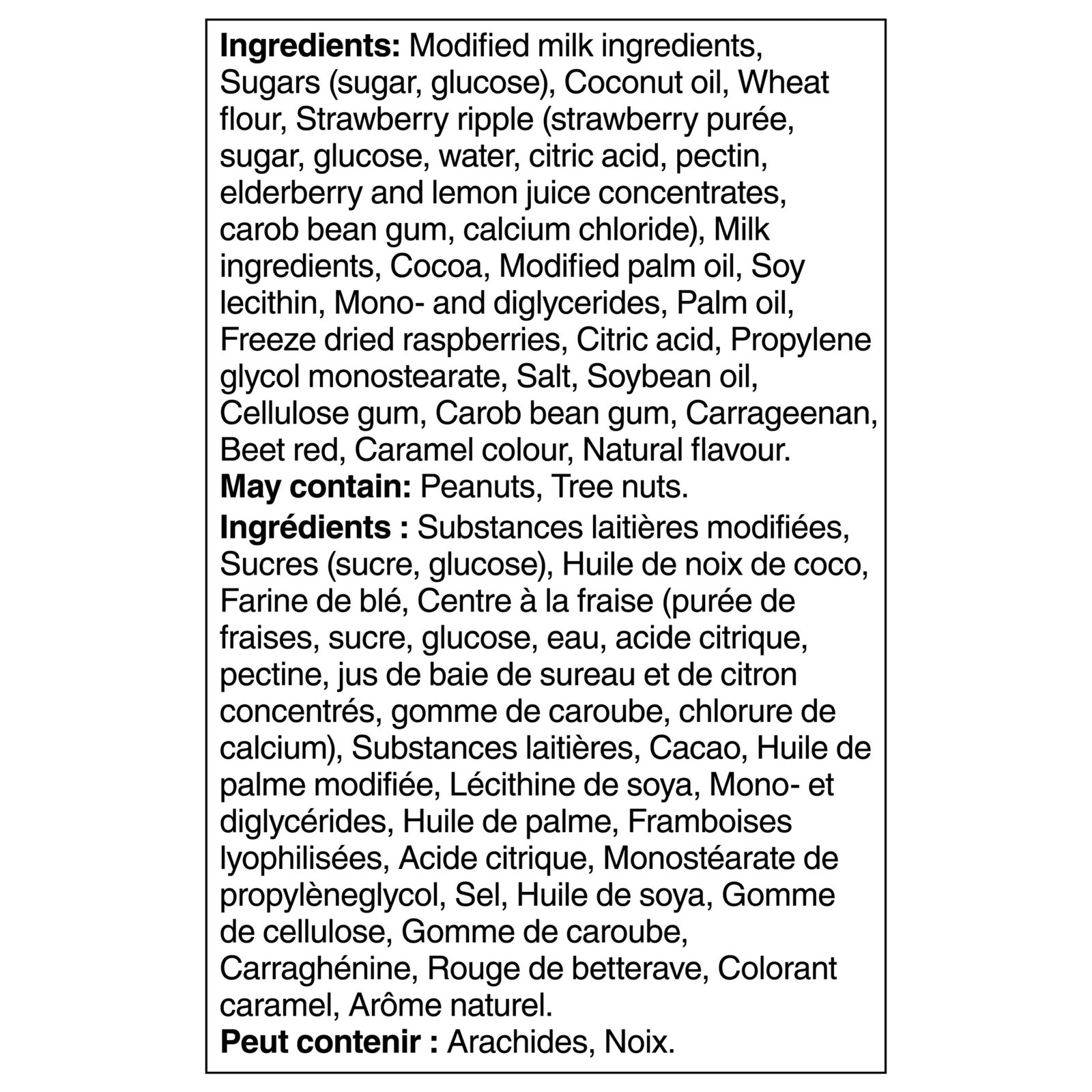 | Ingredients | Ingredients: Modified milk ingredients. Sugars (sugar. glucose). Coconut oil. Wheat flour. Strawberry ripple (strawberry purée. sugar. glucose. water. citric acid. pectin. elderberry and lemon juice concentrates. carob bean gum. calcium chloride). Milk ingredients. Cocoa. Modified palm oil. Soy lecithin. Mono- and diglycerides. Palm oil. Freeze dried raspberries. Citric acid. Propylene glycol monostearate. Salt. Soybean oil. Cellulose gum. Carob bean gum. Carrageenan. Beet red. Caramel colour. Natural flavour. |
