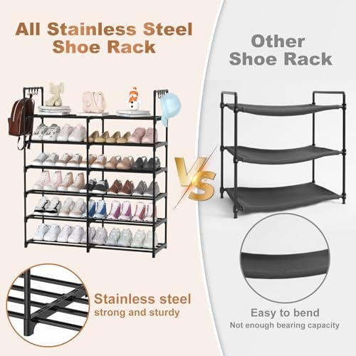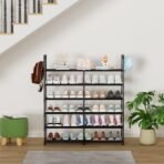 DYJIEKAI 2-Row 6-Tier Shoe Rack. Black Metal Stackable Shoe Shelf with Multifunctional Hooks. Hold 24-30 Pairs. Space Saving Shoes Organizer for Closet.Show Rack