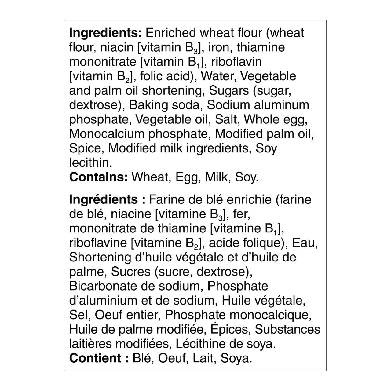 | Ingredients | Wheat flour. Water. Vegetable and palm oil shortening. Sugars (sugar. dextrose). Whole egg. Baking soda. Sodium aluminum phosphate. Vegetable oil. Salt. Monocalcium phosphate. Palm oil. Spice. Modified milk ingredients. Soy lecithin. Contains: Wheat. Egg. Milk. Soy. |